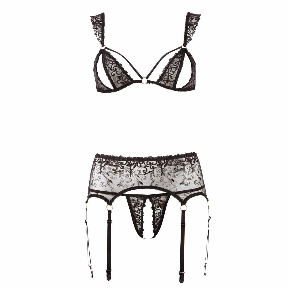 Dette smukke sæt med sorte stropper og broderet tyl garanterer dig din elskedes opmærksomhed.