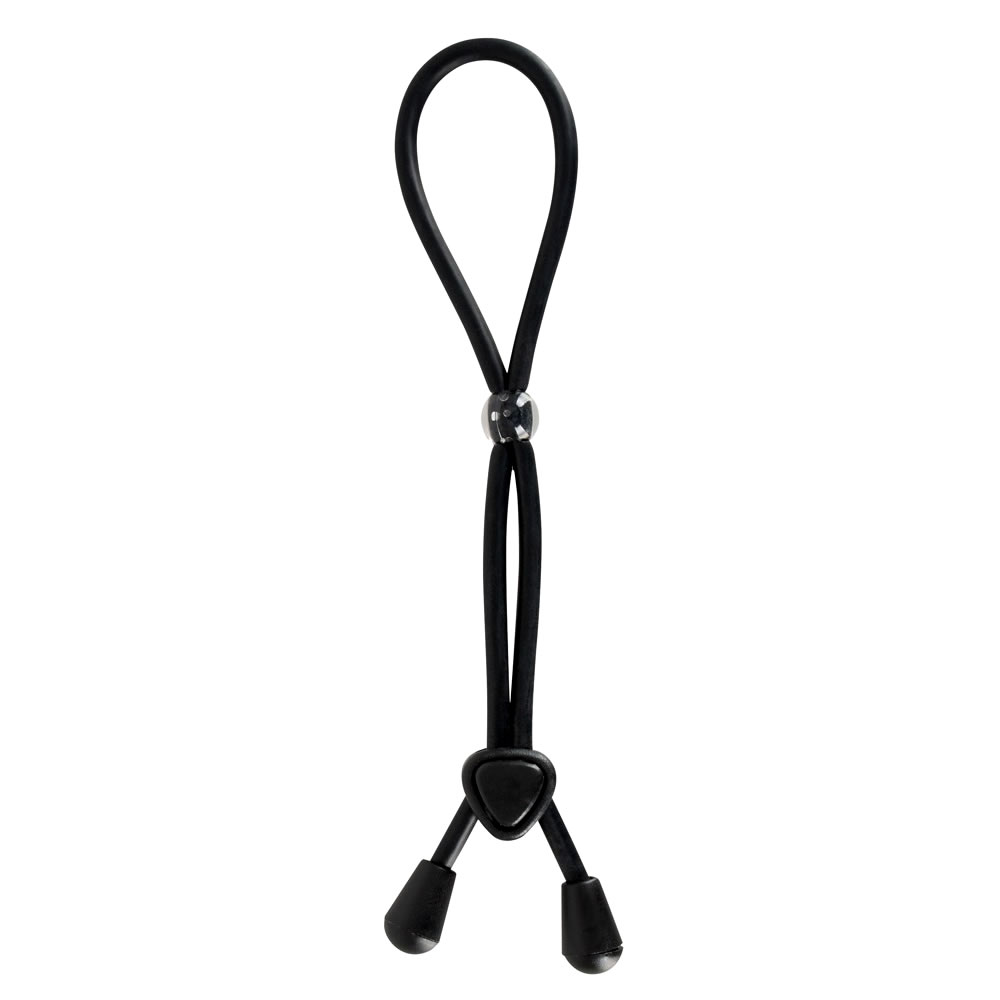 Den sorte sløjfe, der er delt med en gennemsigtig perle, placeres omkring penisroden og testiklerne.