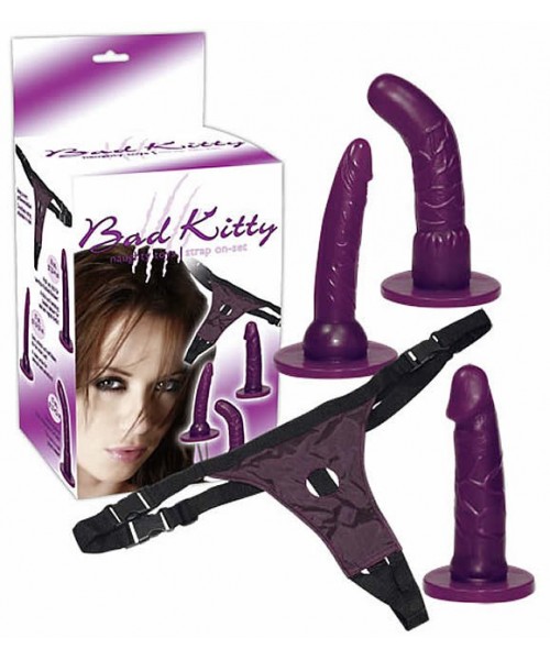 Bad Kitty Strap-On Sæt med justerbart harness og 3 forskellige dildoer.
