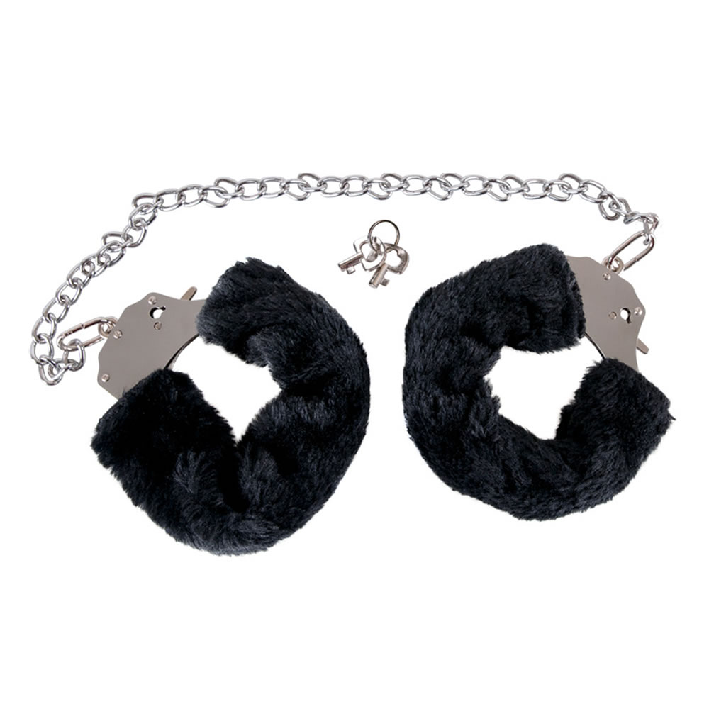 Tunge håndjern med lang forbindelseskæde og sorte, aftagelige plys overtræk.