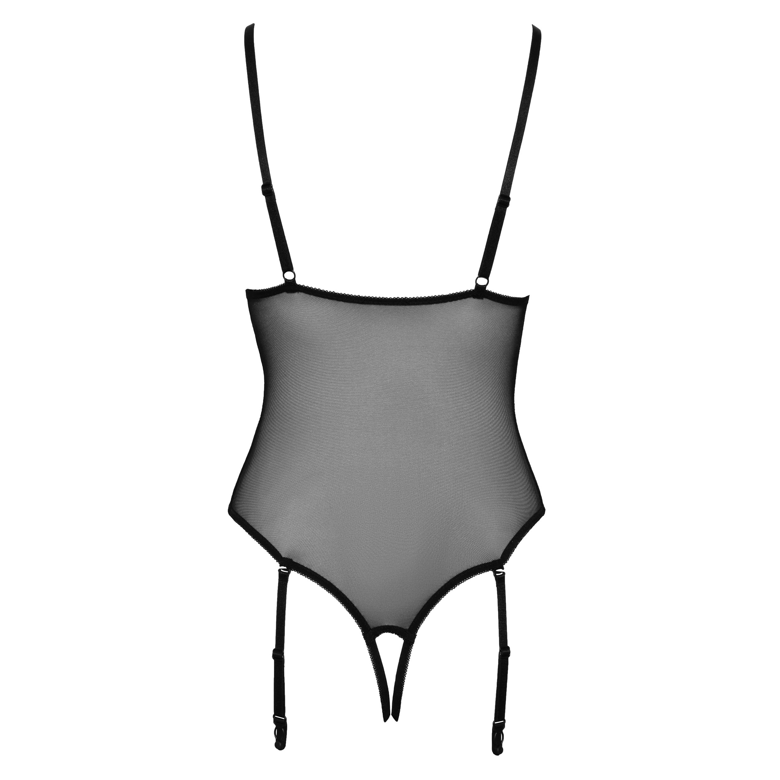 Bodyen er forførende åben i skridtet, og de justerbare, aftagelige seler sikrer en perfekt pasform.