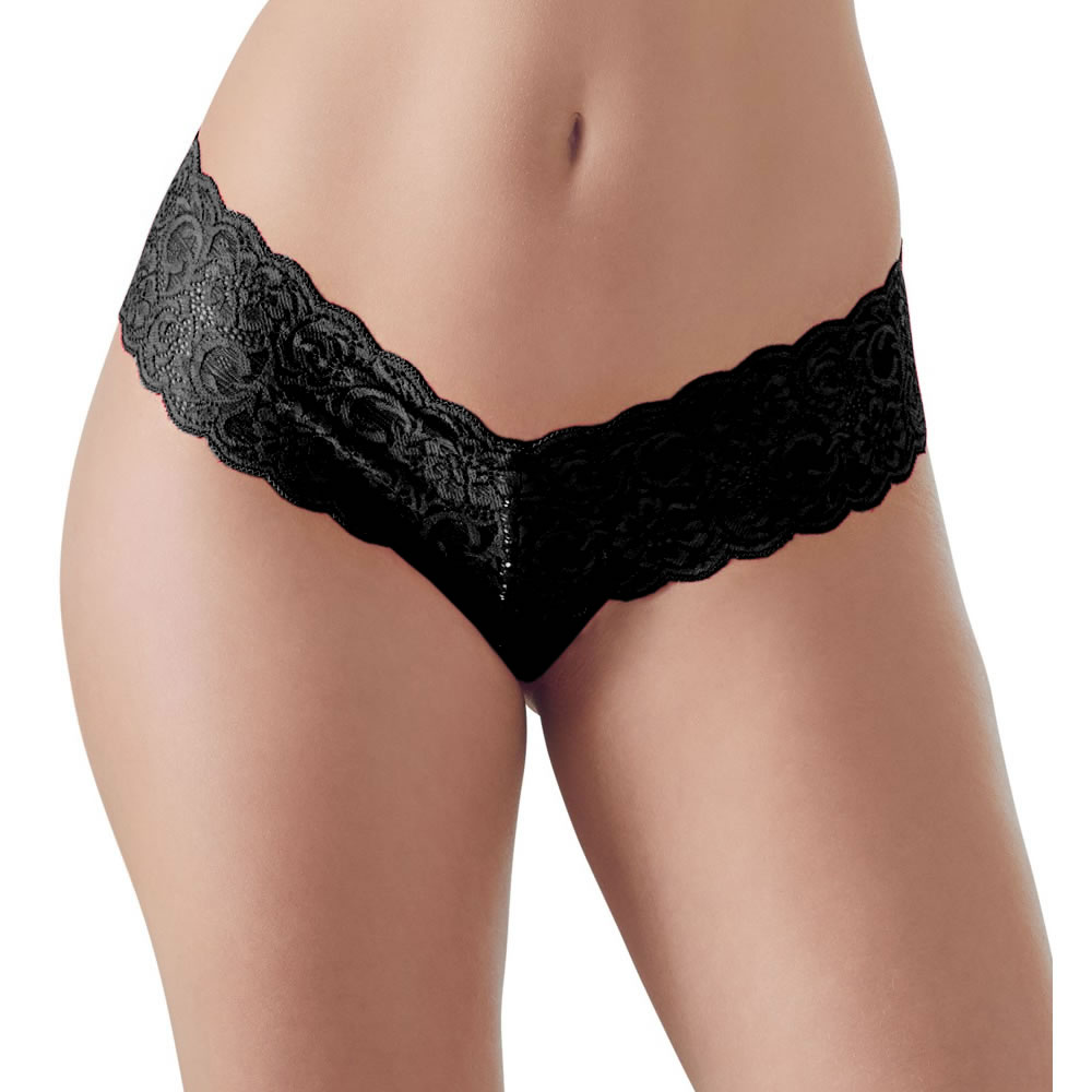 Eksklusive sorte blonde G-strengs trusser med hvid perlekæde i skridtet.