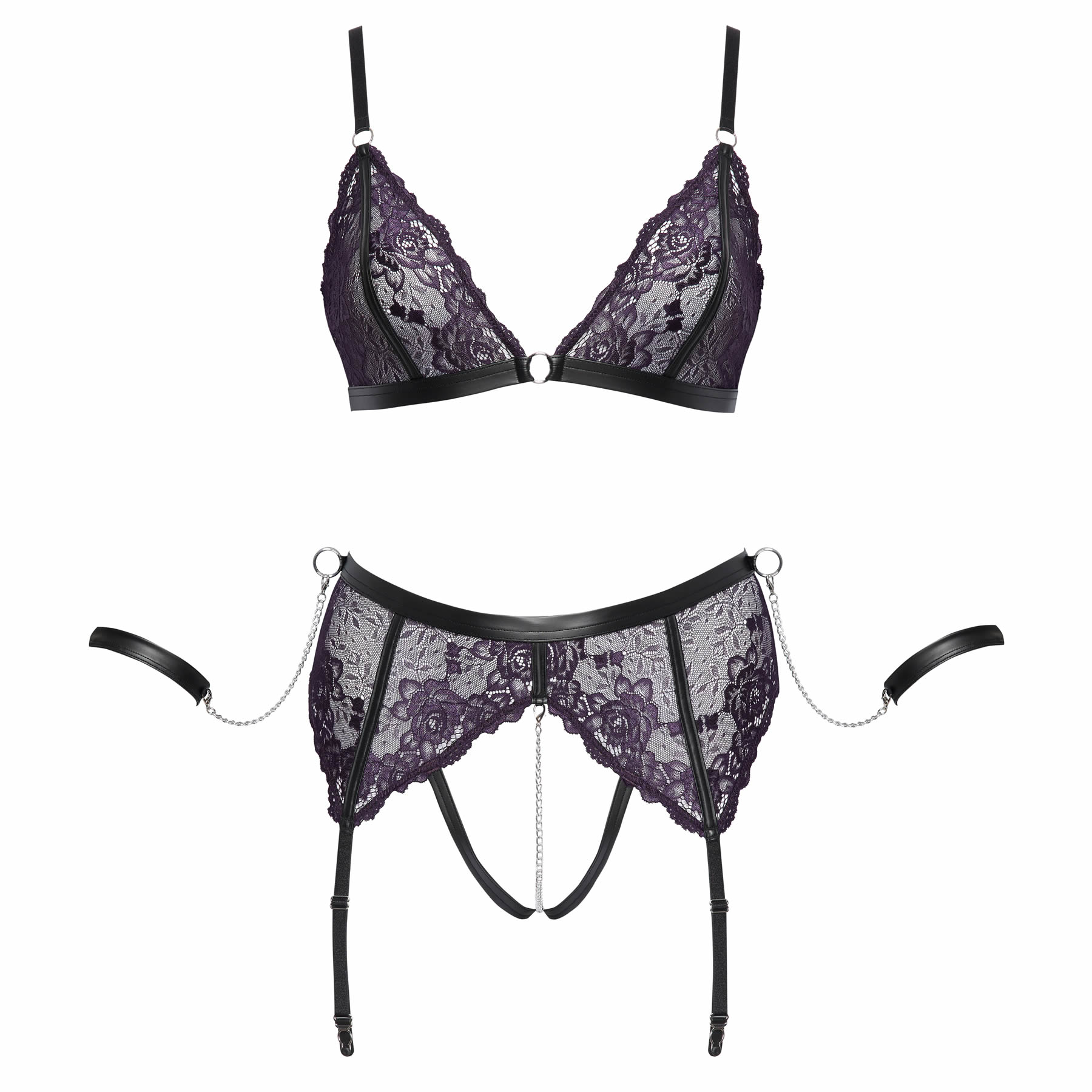 Sættet består af en forførende bh med bløde skåle, en hofteholdertrusse med erotisk åbent skridt og en stimulerende, aftagelig kæde samt to matchende manchetter.