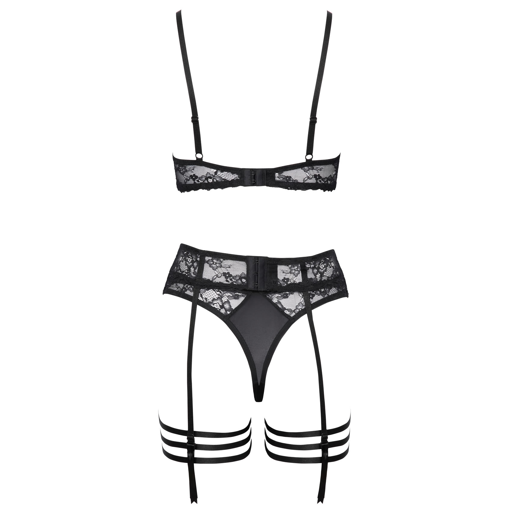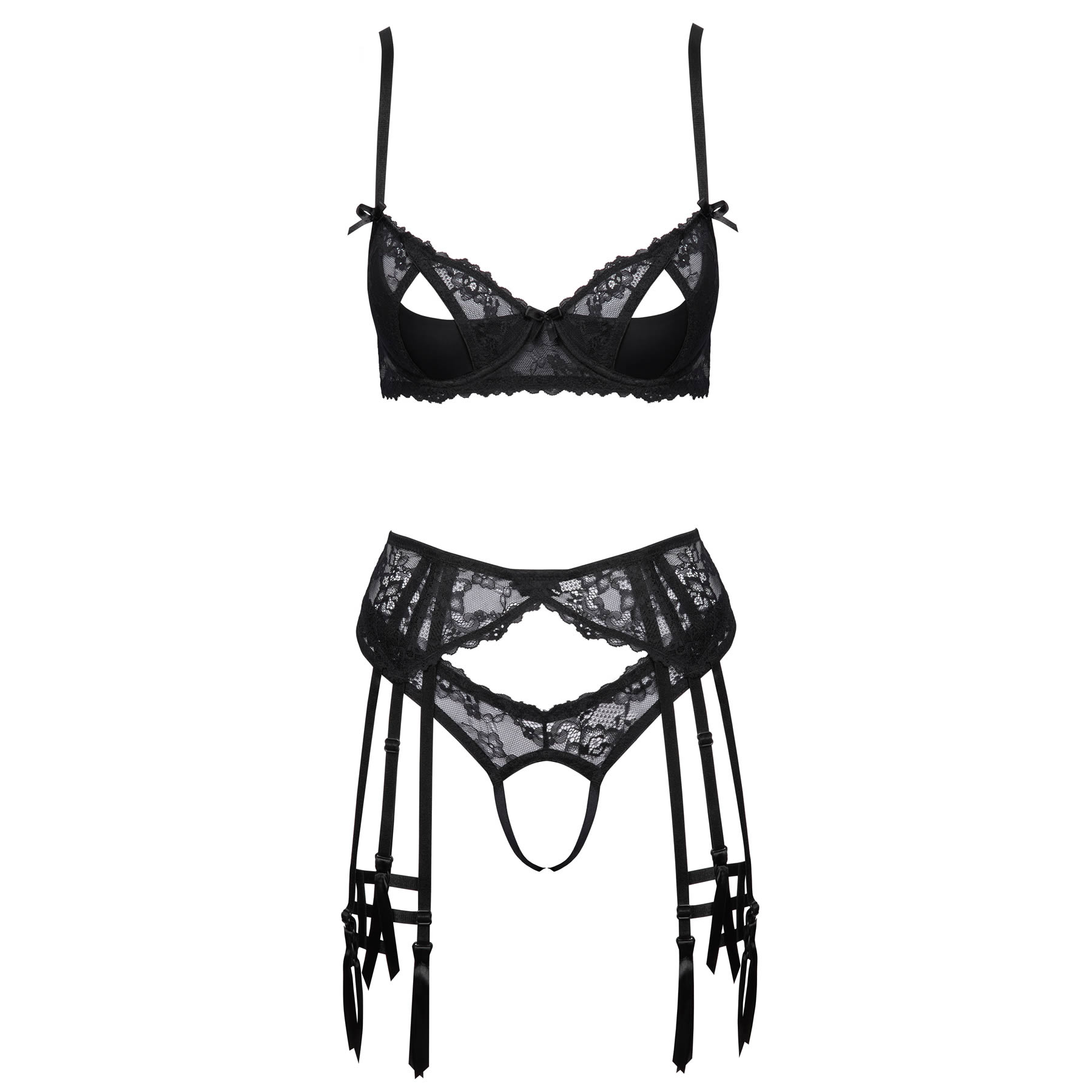 Sættet består af en bøjle-bh med halve skåle, et dekorativt strømpeholderbælte, en g-streng med åben front samt stilfulde strømpebånd, der giver et eksklusivt og sensuelt look.