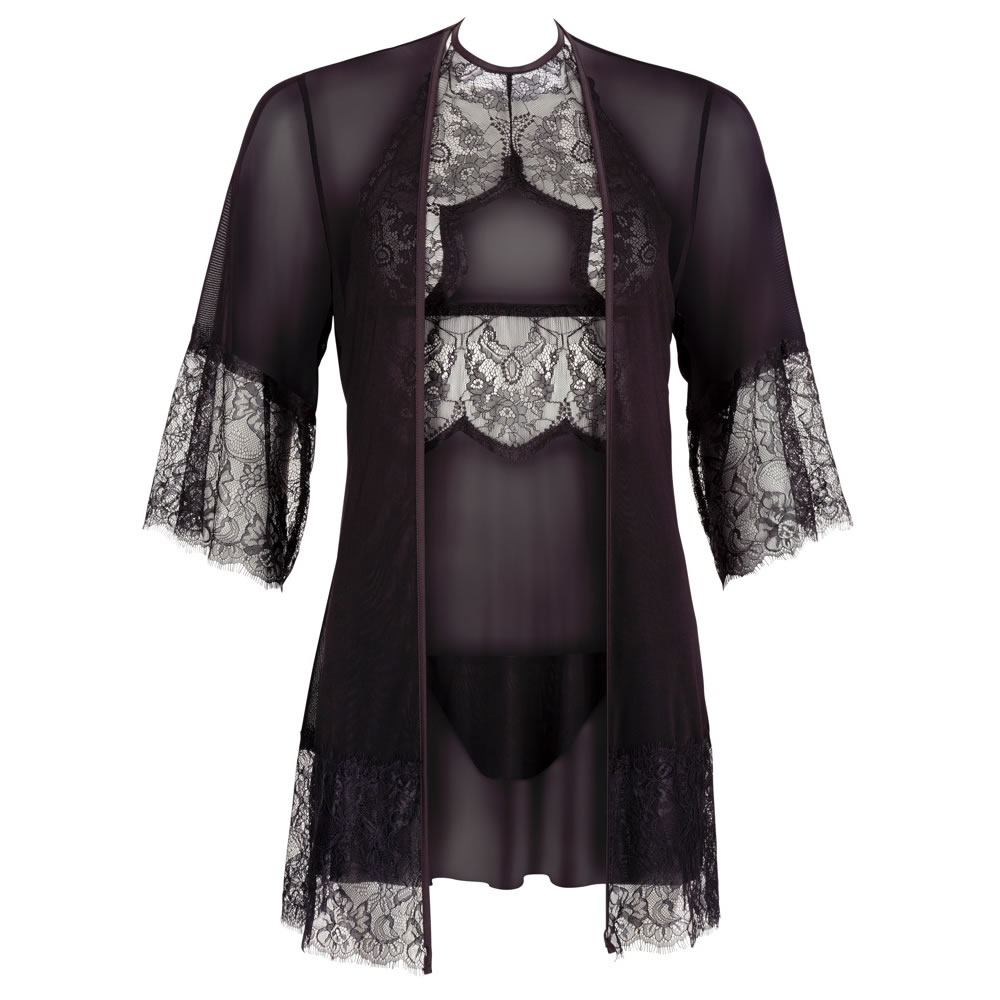 Sættet fuldendes af en fløjlsblød kimono i sort, som lægger sig let over kroppen og fremhæver dine kurver med sine halvlange ærmer og feminine fald. Perfekt til at skabe spænding, når du lader kimonoen glide af.