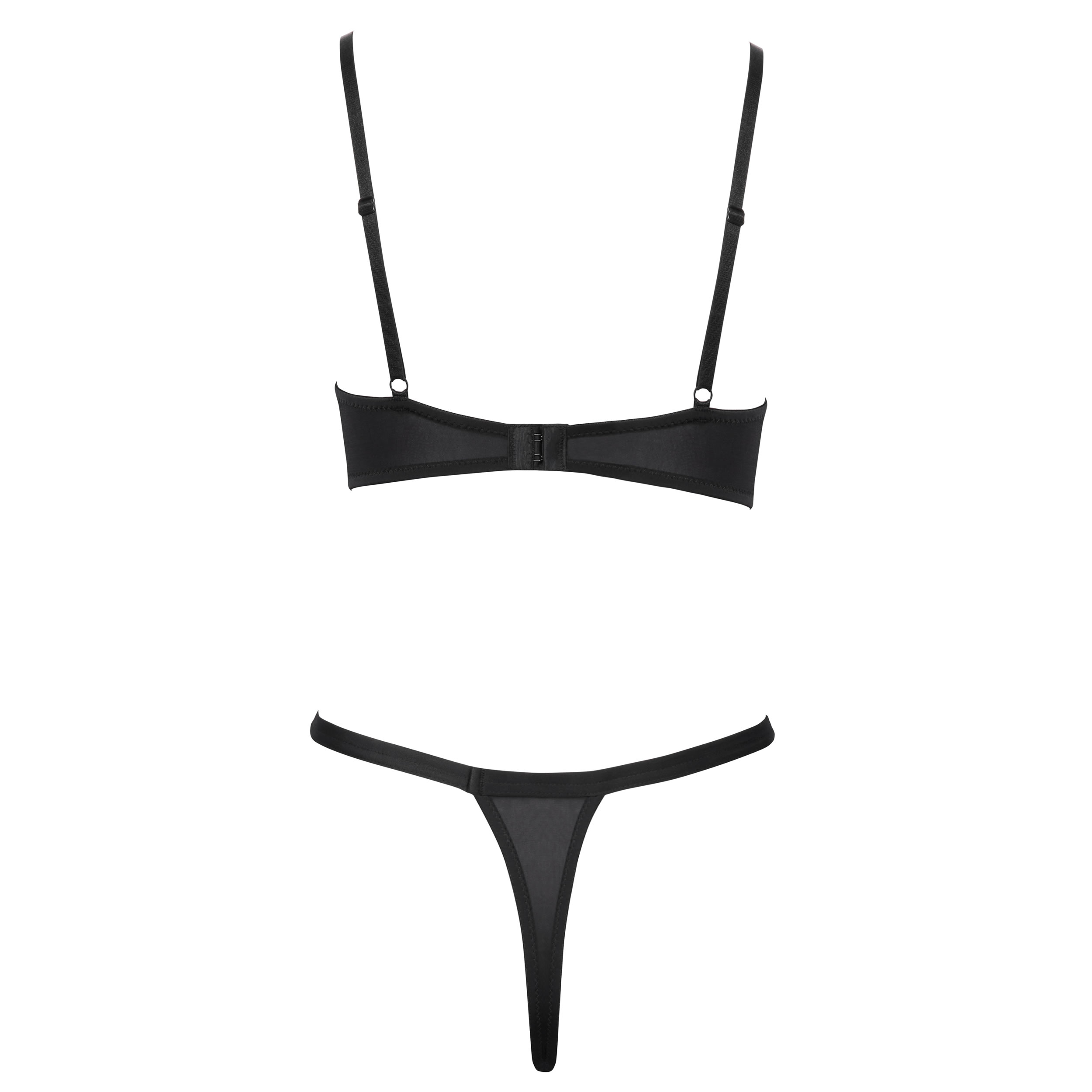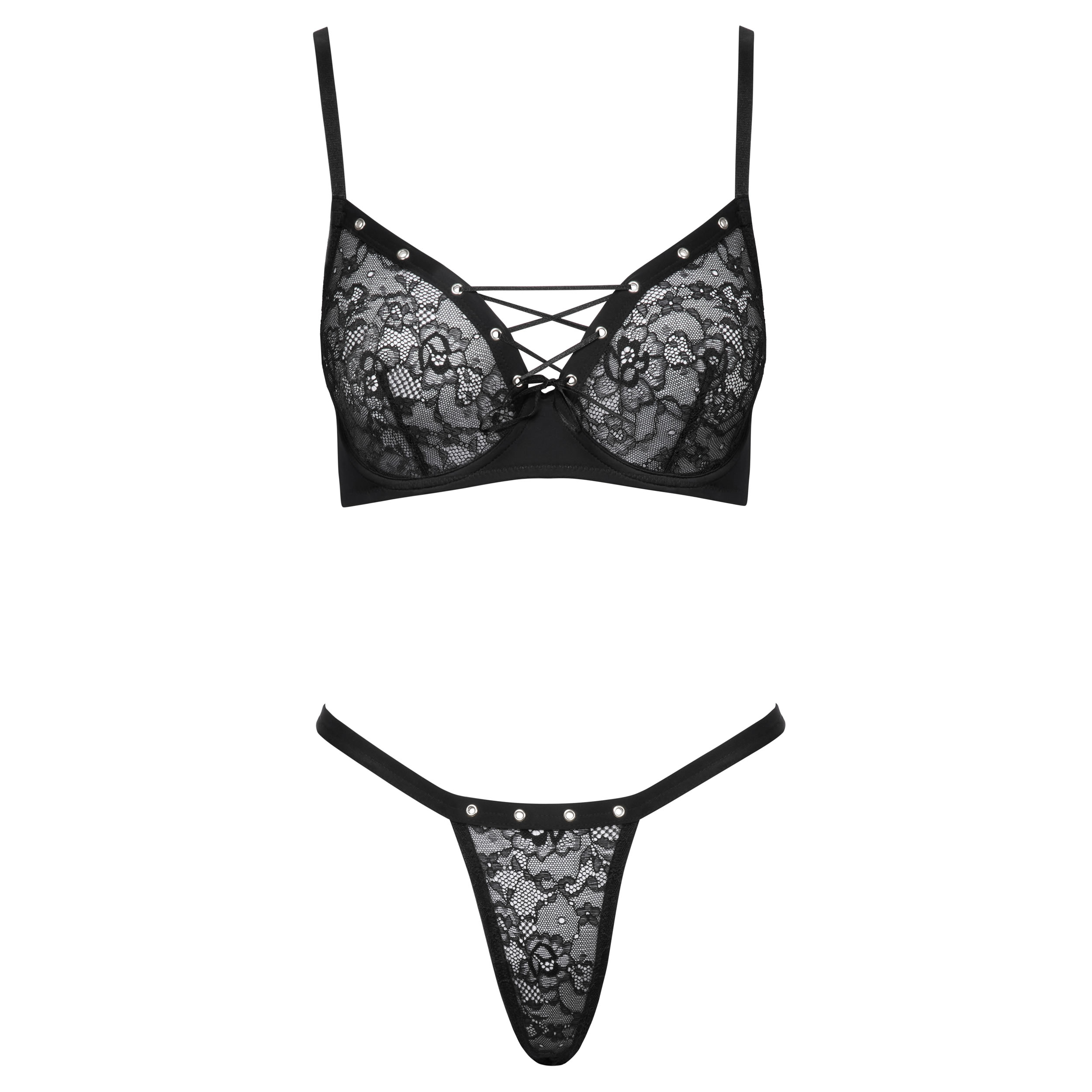 Sættet består af en bh med bøjle og en rio-g-streng, begge designet i blød, elastisk blonde med sølvfarvede dekorative øjer, der giver et unikt og forførende look.