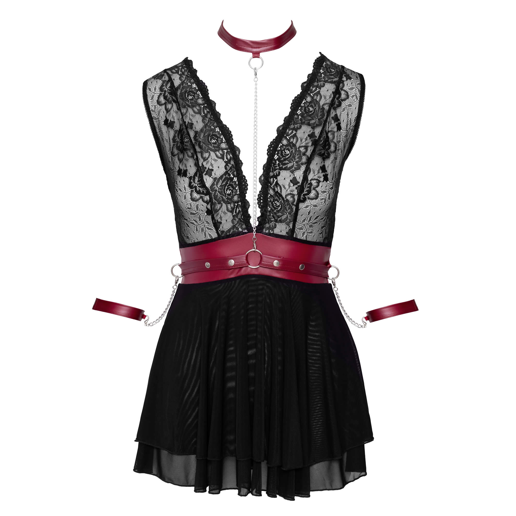 Oplev forførende bondage-leg i en sensuel kombination af blonder, powernet og mat rødt look med denne ekstra frække babydoll fra Cottelli BONDAGE.