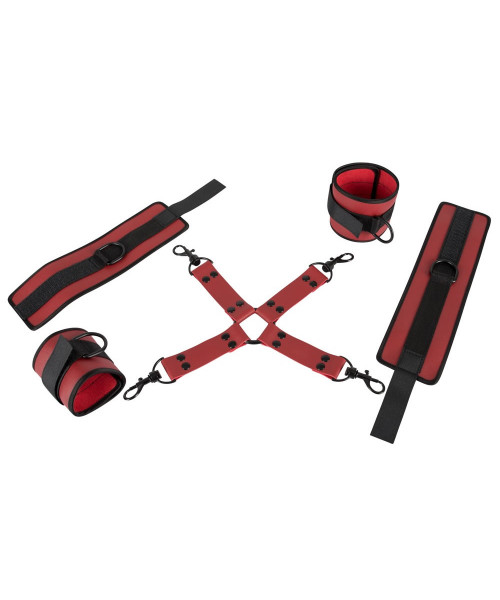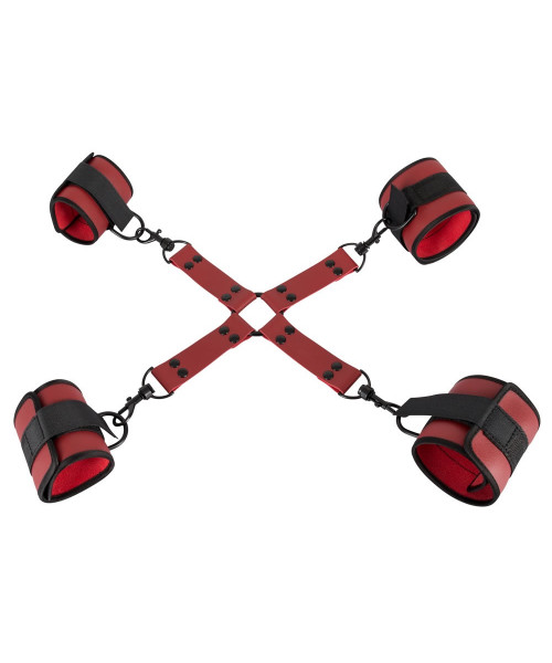 The two handcuffs and two ankle cuffs are attached to the bondage cross by snap hooks and rings but they can also be removed and used separately. The restraints can be adjusted with the hook and loop fasteners.