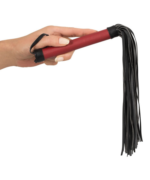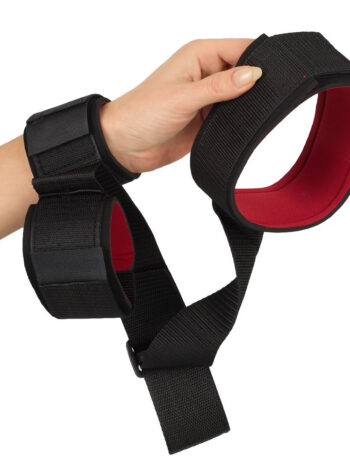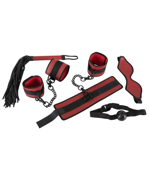 5-piece set: opaque blindfold, ball gag with breathing holes (Ø 3.5 cm), a handy flogger, handcuffs and ankle cuffs.