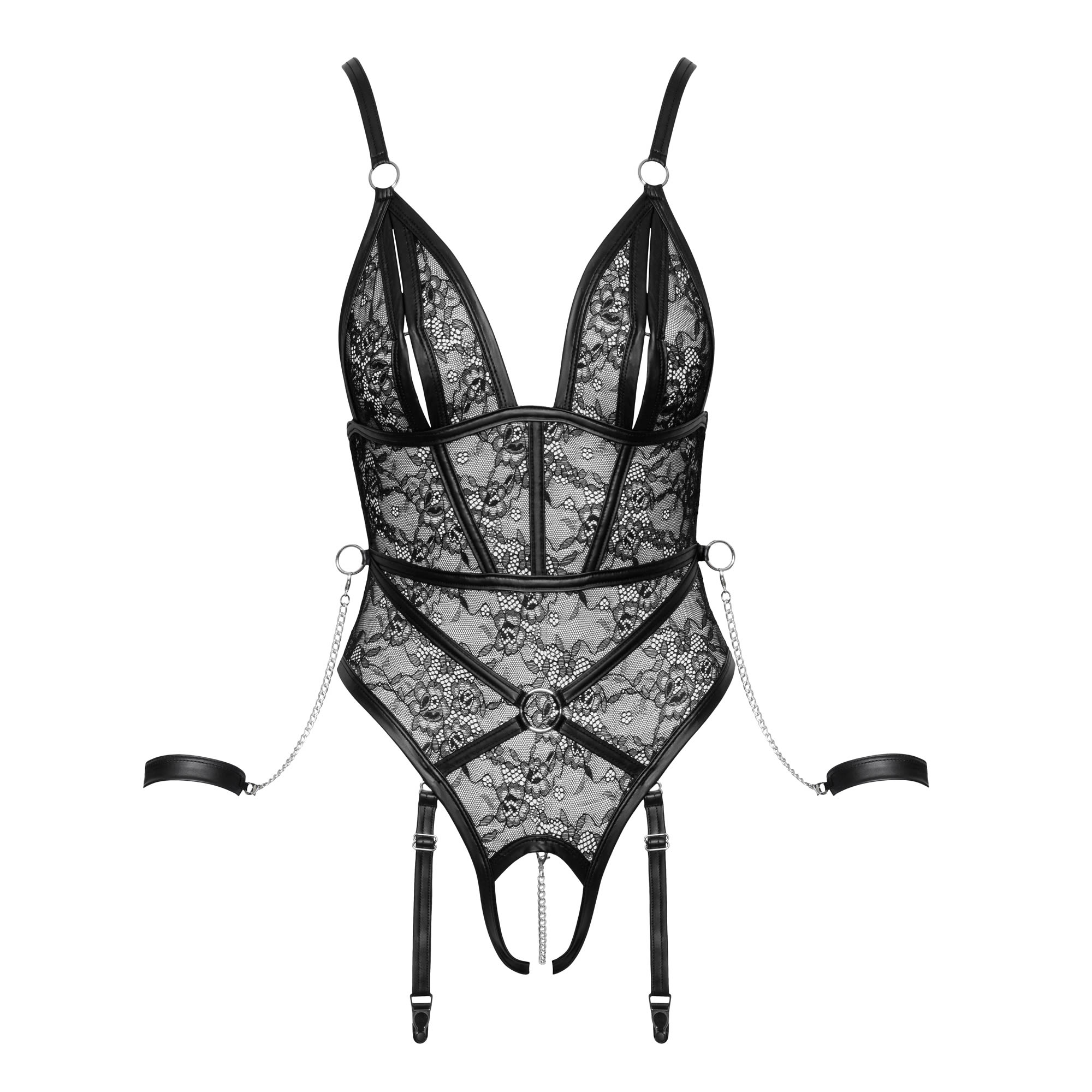 Lavet af bløde, sorte strækblonder i et sensuelt harness-design med frække detaljer i mat look og sølvfarvet metaltilbehør.