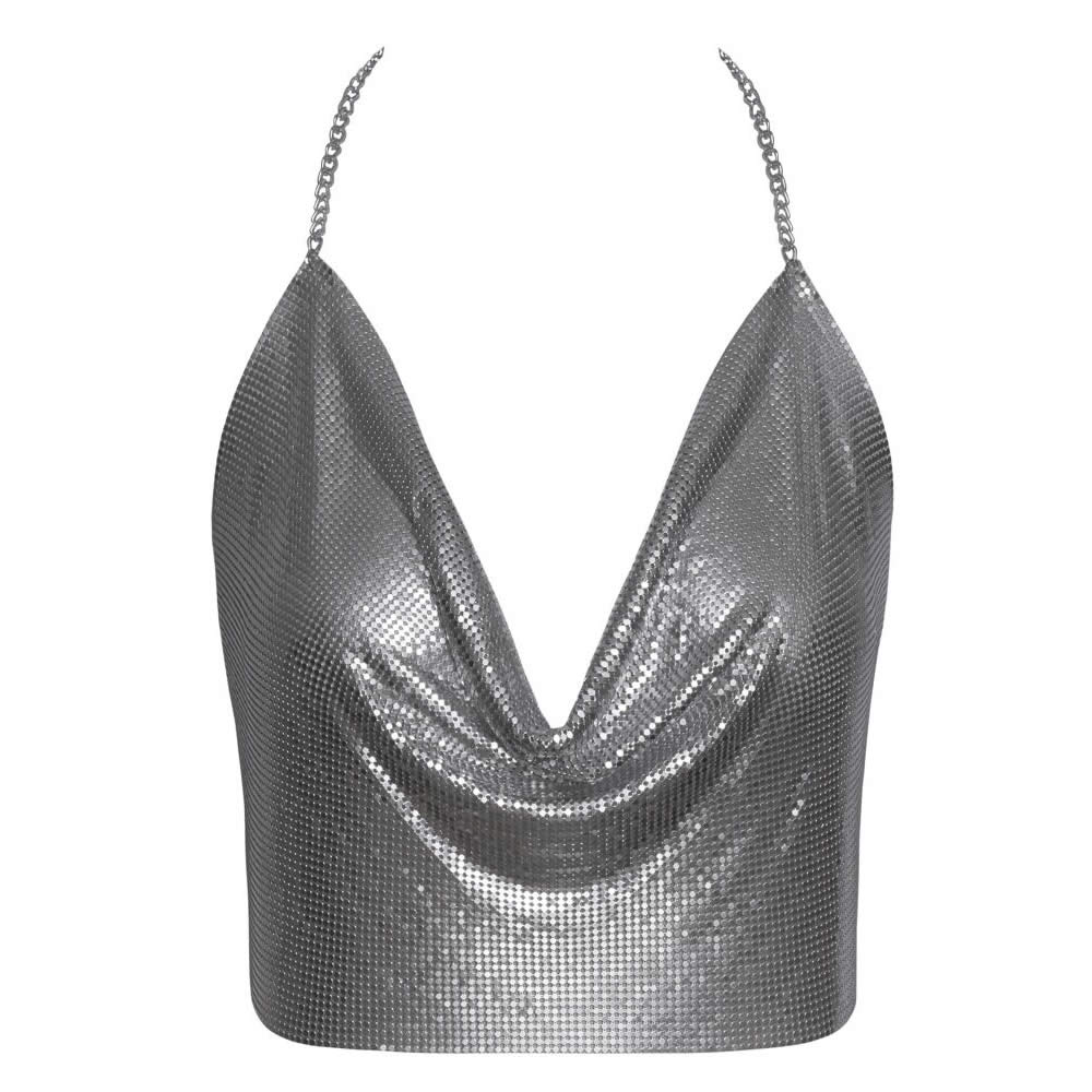Den eksklusive top består af hundredvis af små, sølvfarvede metalplader, der sammen danner et dragende vandfaldslook, som følger dine former og reflekterer lyset, hver gang du bevæger dig.
