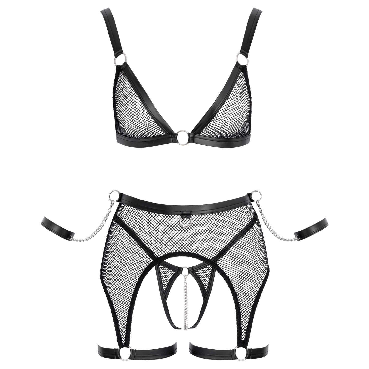 Dette forførende sæt kombinerer luksuriøst netstof og matte detaljer med en pirrende bondage-stemning, der gør dine erotiske drømme til virkelighed.