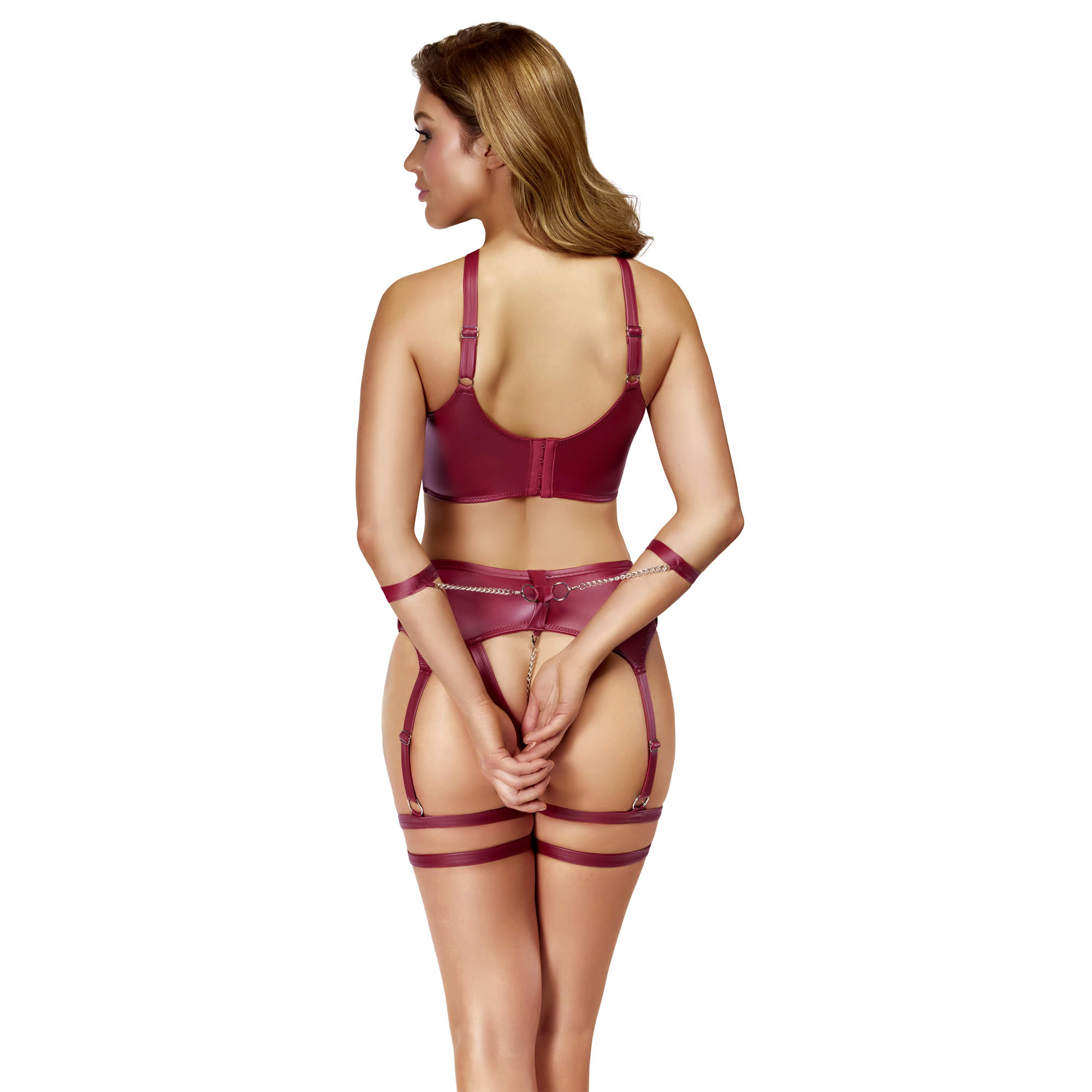 Alt-i-én-sæt: Bh, skridtløs g-streng, stropper og håndjern – alt matcher i det samme dybe mørkerøde matte look.