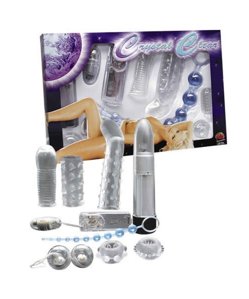 9-delt gennemsigtigt lystsæt med vibrator, påsatser, vibroæg, anallegetøj, penisringe og lystkugler.