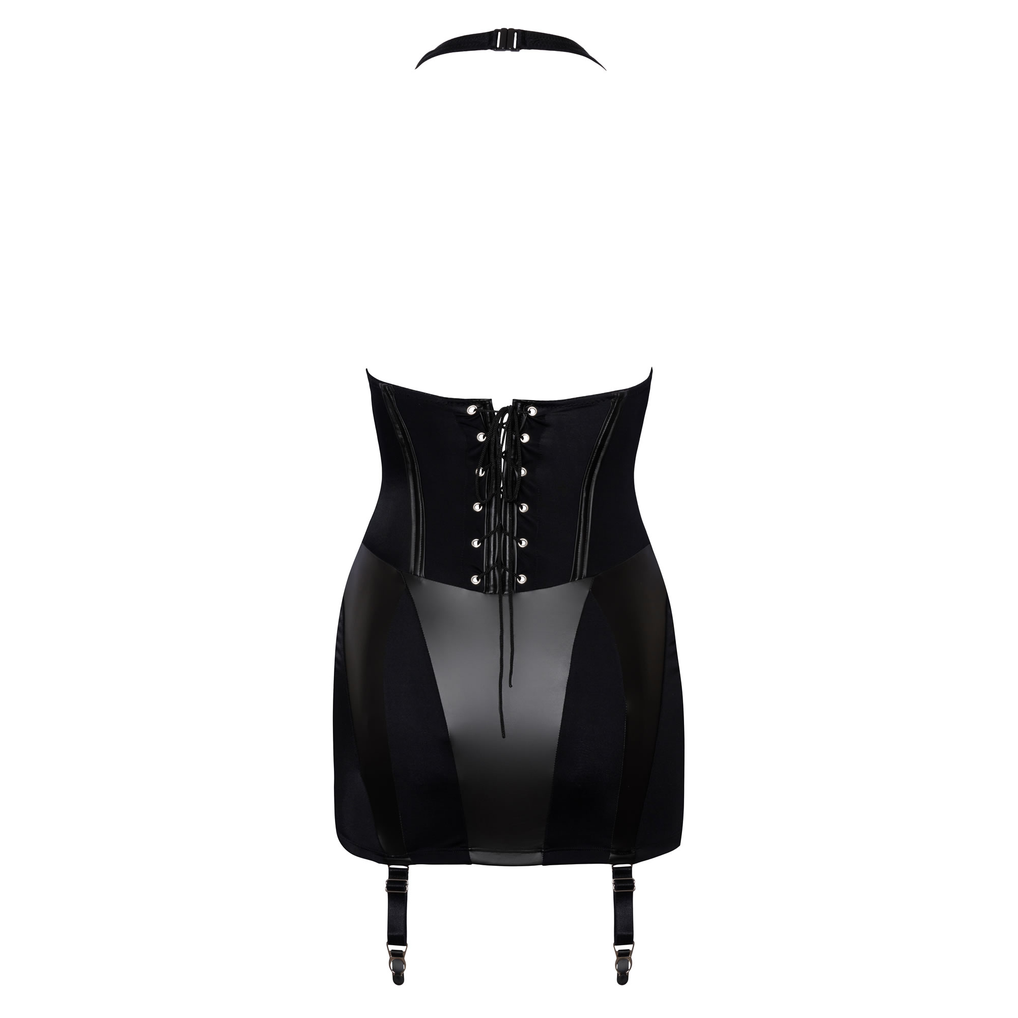 Figursyede indsatser i mat sort look tilføjer en eksklusiv og rå udstråling, mens halterneck-designet med kliplukning giver en forførende finish.