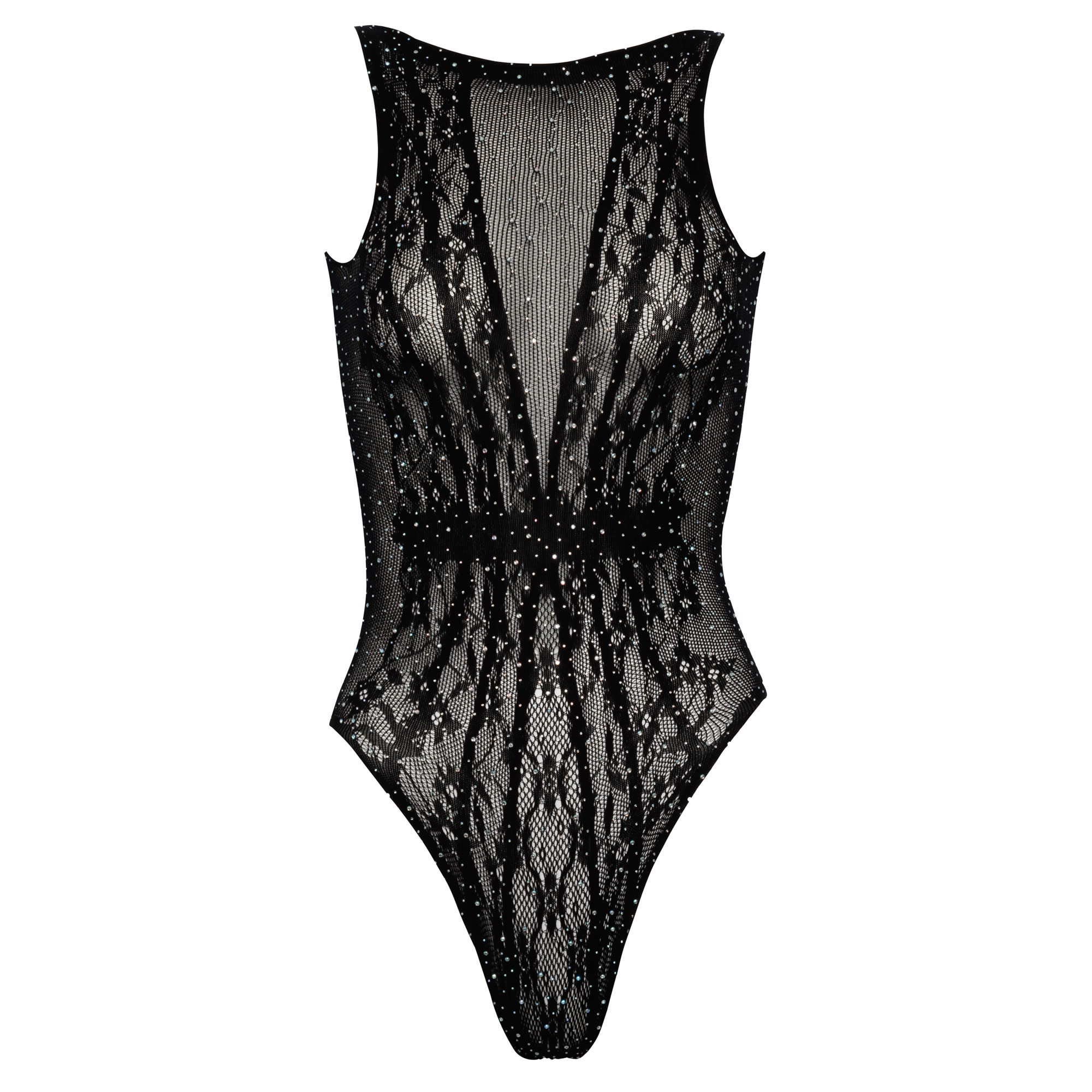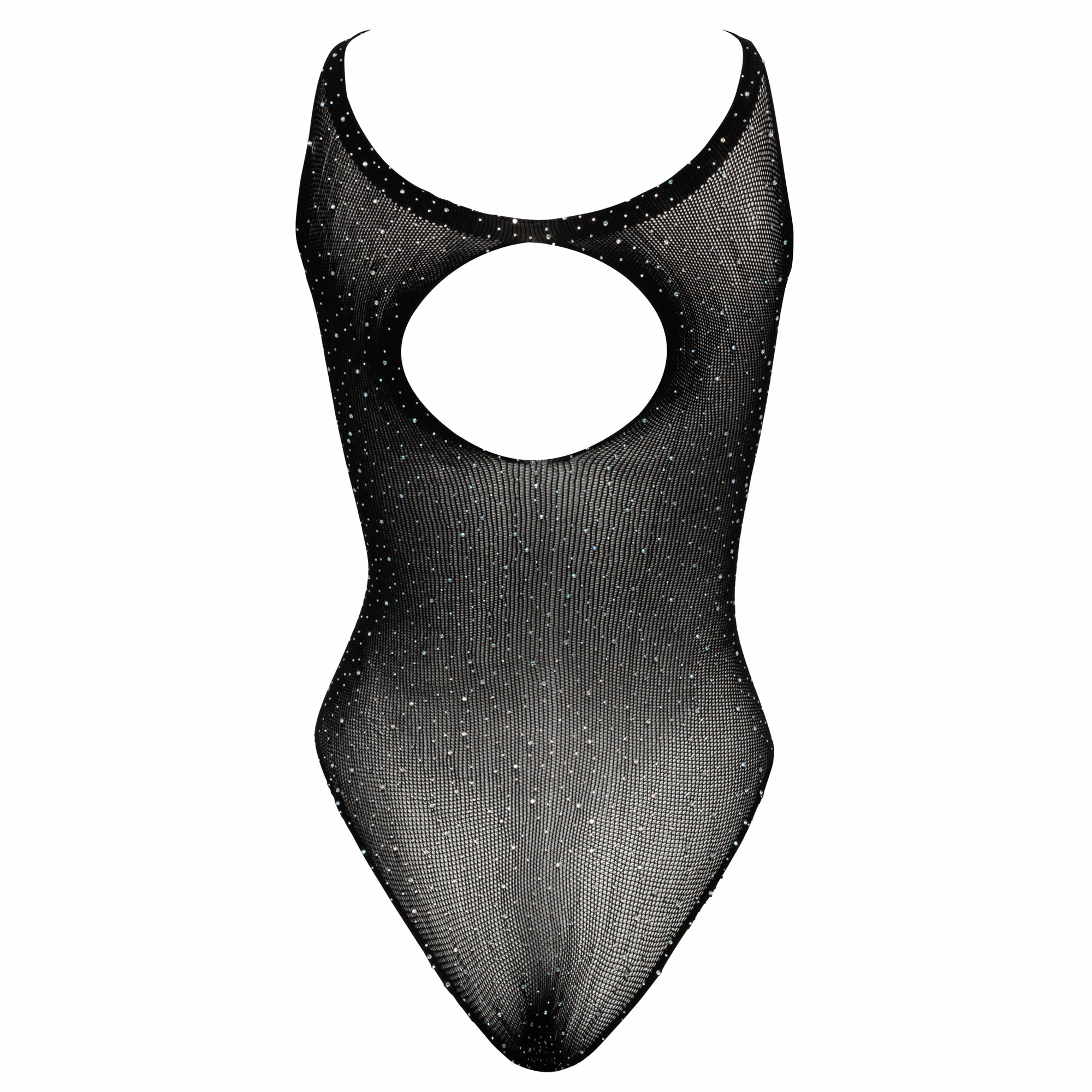 Lavet af fint, halvtransparent stretchmateriale, der smyger sig om kroppen, og besat med funklende rhinsten i forskellige størrelser, som fanger øjet og vækker fantasien.