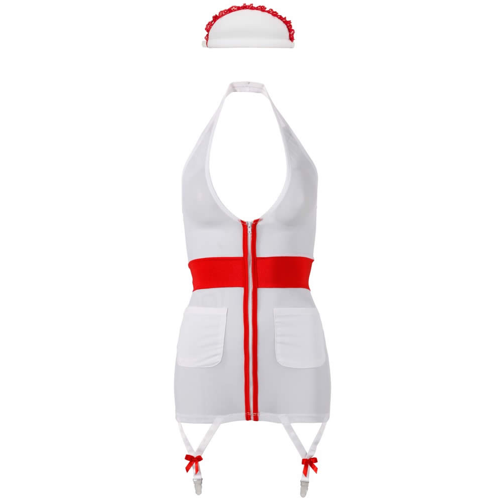 Kostumet er fremstillet i hvidt powernet, der lader huden skinne frækt igennem, mens det klassiske røde kors på fronten sender tankerne direkte til lægefaget – med en yderst forførende drejning.