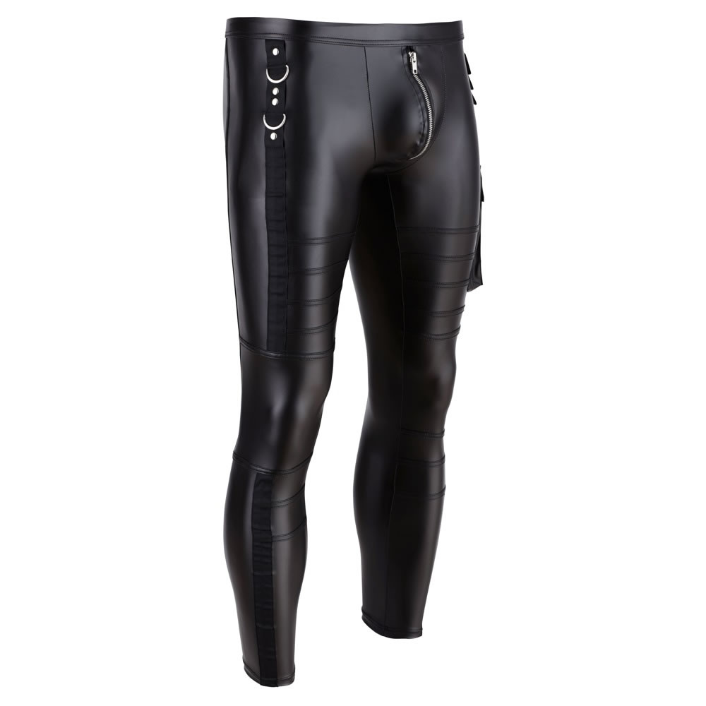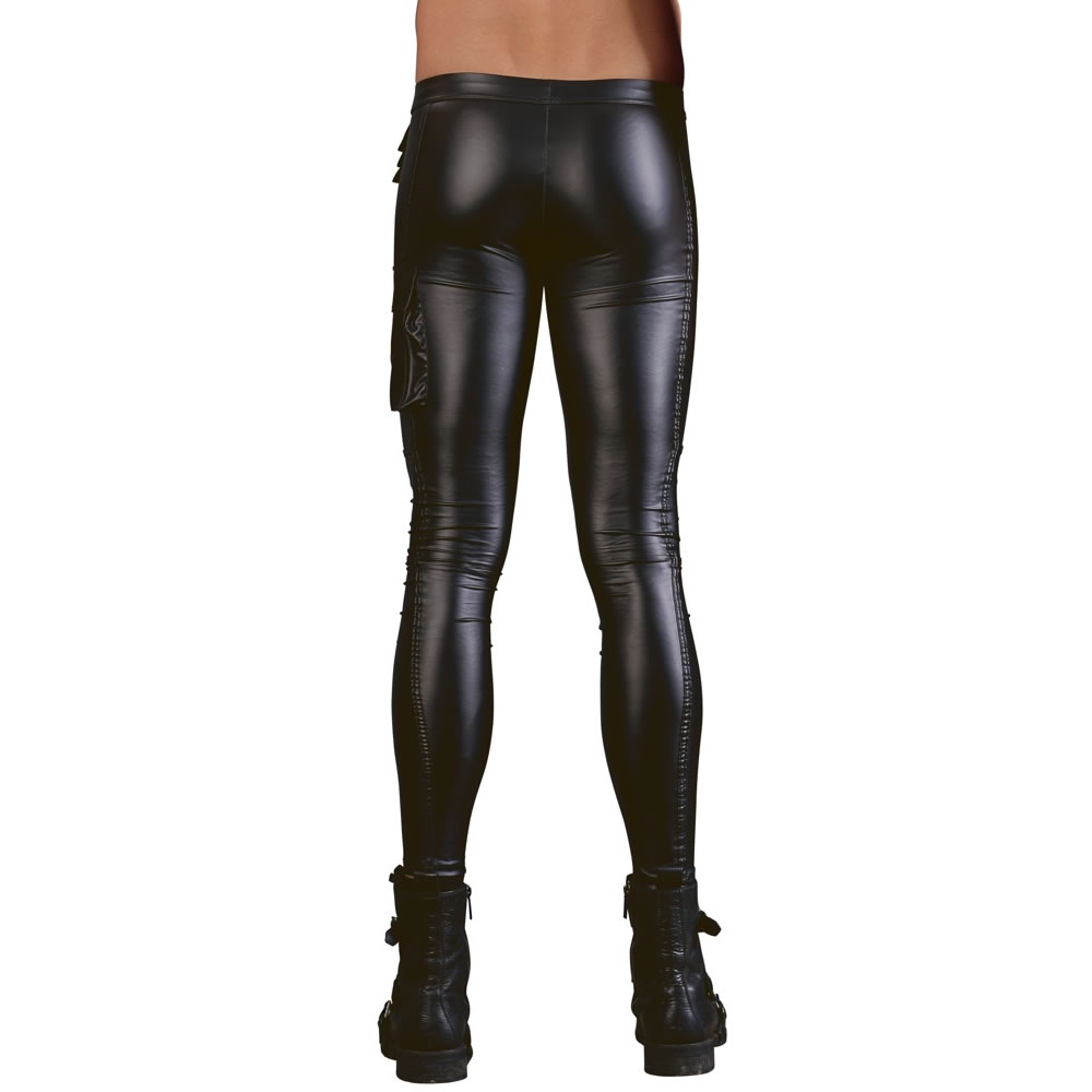 Med en sidelomme, fastgjorte bånd, nitter og en ring får bukserne et dominerende og maskulint udtryk.