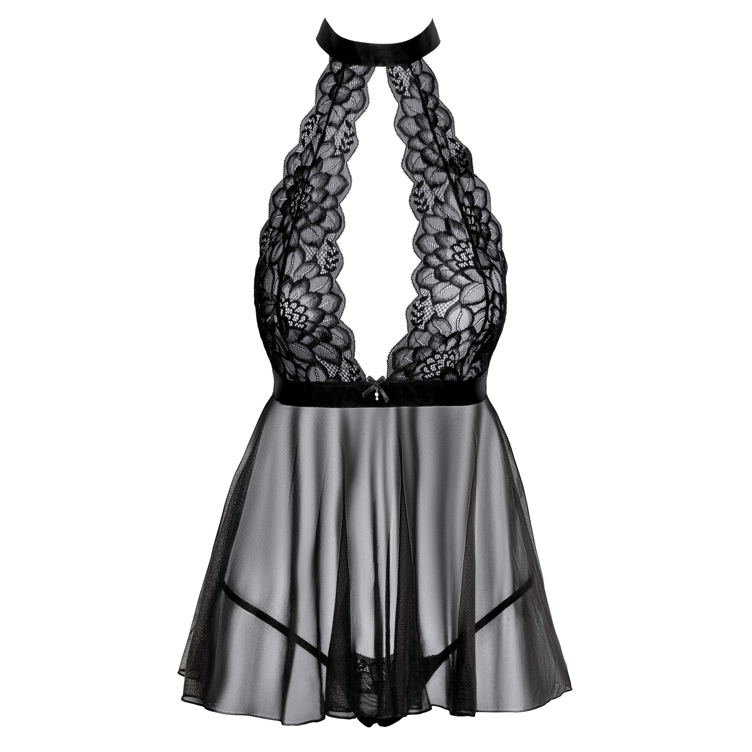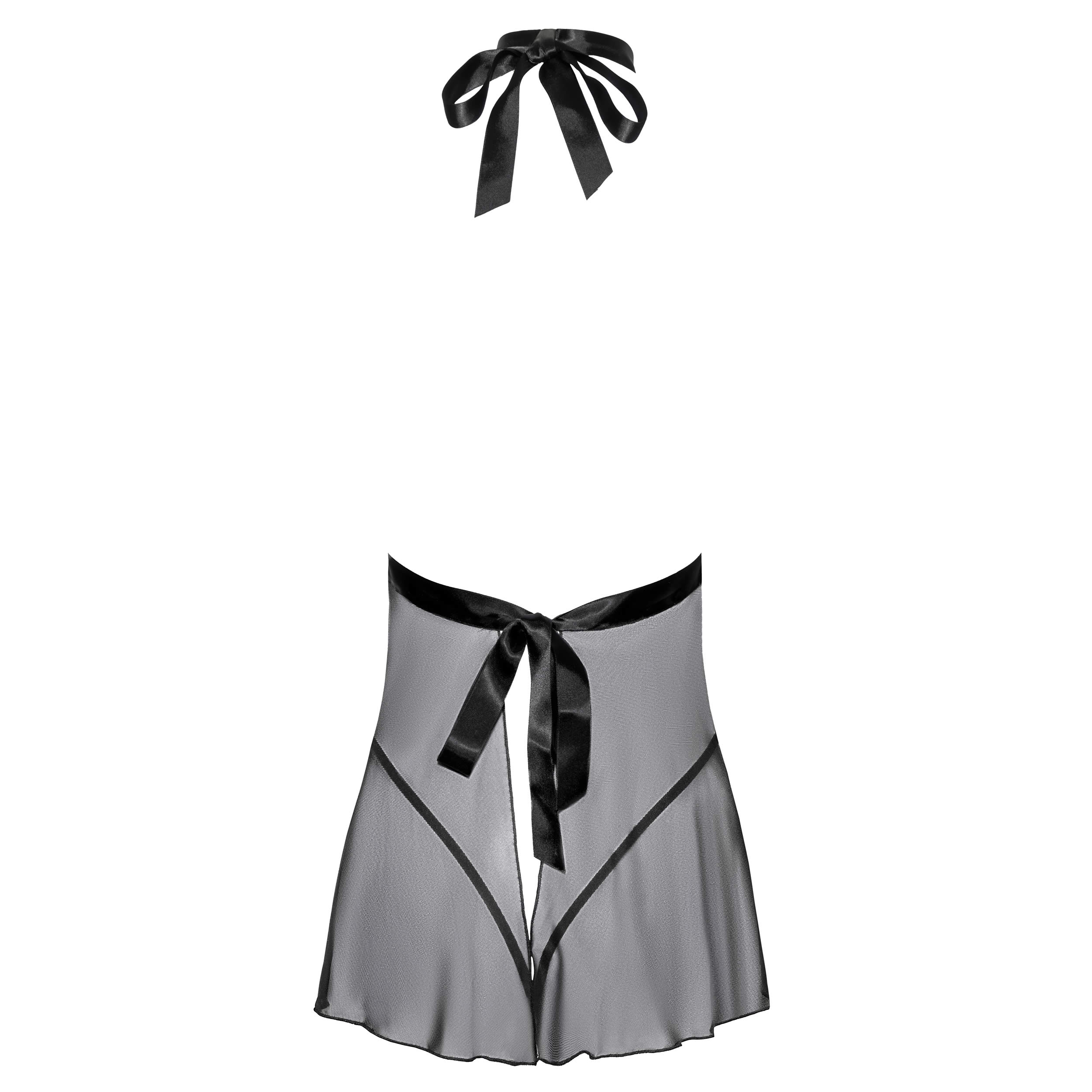 Babydollen er rygløs, hvilket giver et pirrende element, mens satinhalsbåndet bindes i nakken og et satinbånd snøres bagpå, så du får en justerbar og perfekt pasform.