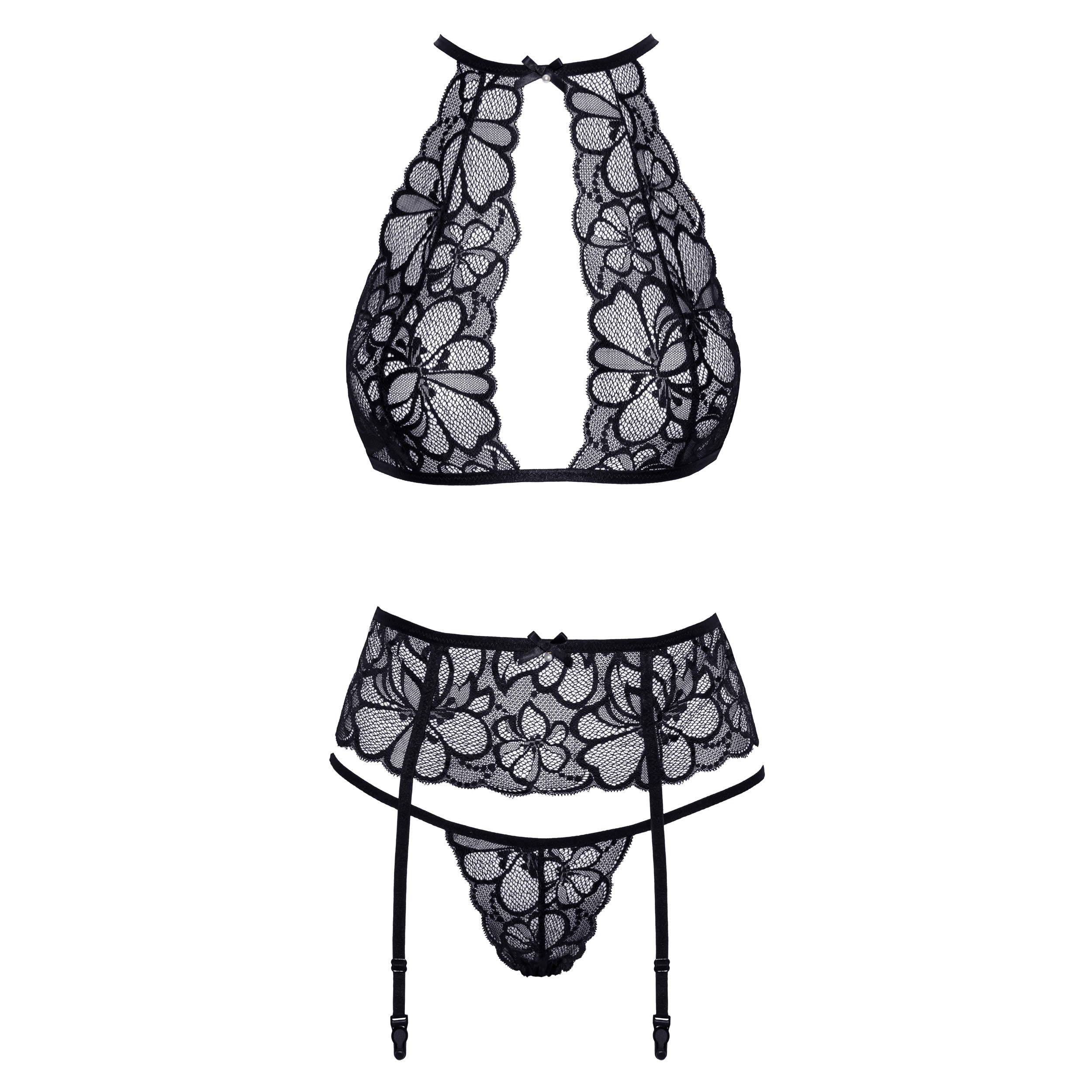 Forkæl dig selv med dette elegante og sensuelle lingerisæt fra Kissable, der består af en blød bh, bindebånd og g-streng, alt sammen fremstillet i fine blomsterblonder.