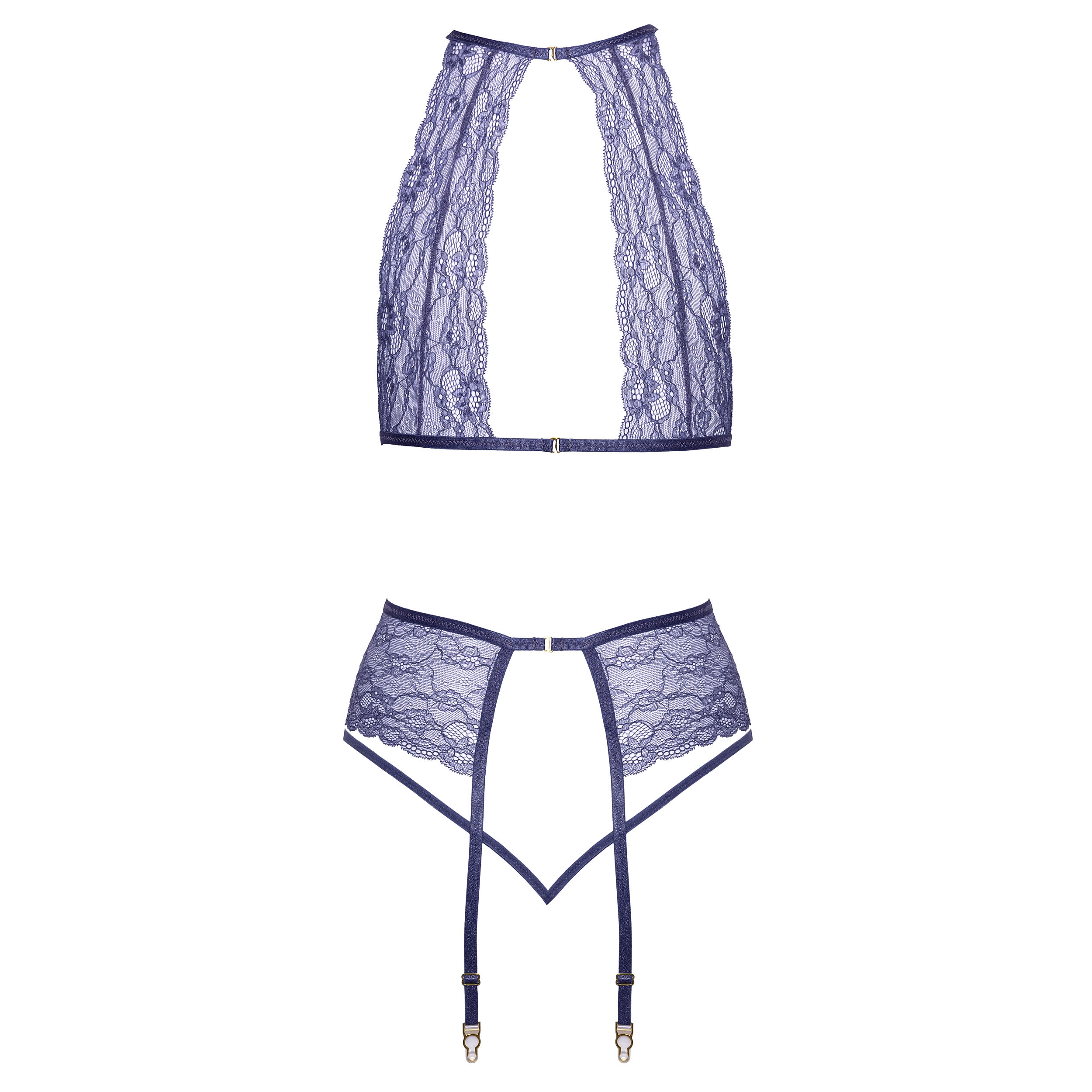 Sættet består af en blød bh, et bindebånd og en g-streng, alle skabt i fine, elastiske blonder, der giver en perfekt pasform og maksimal komfort.