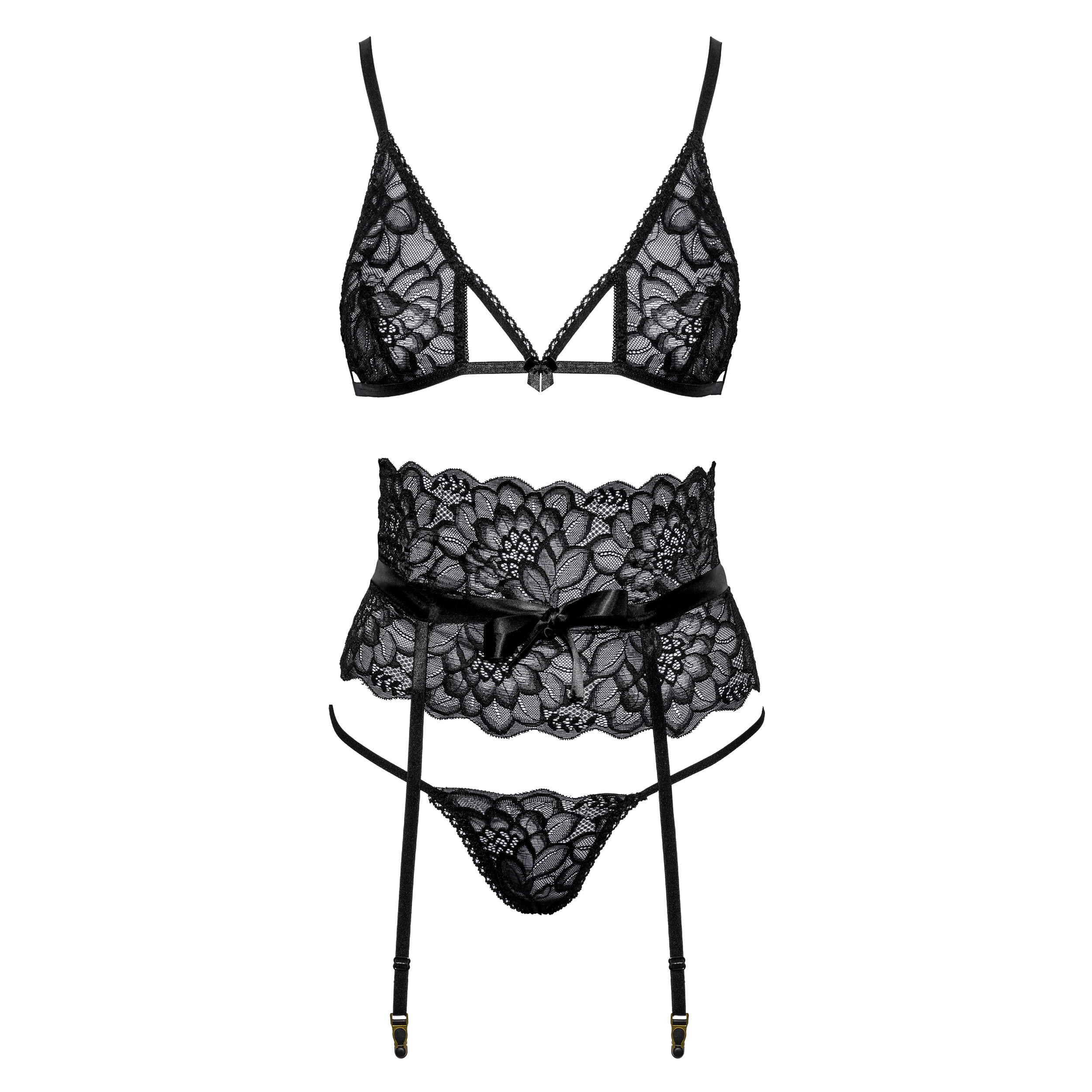 Lad din femininitet skinne med dette smukke og forførende lingerisæt fra Kissable, der består af en blød bh, bindebånd og g-streng, alt sammen skabt i fine sorte blonder.
