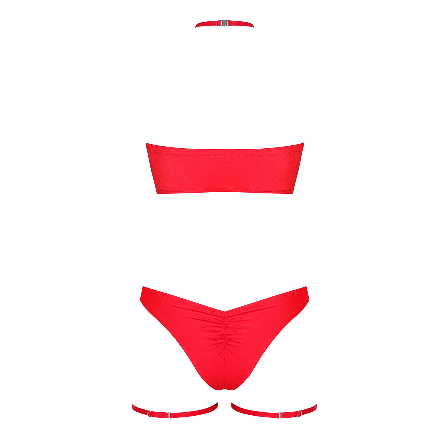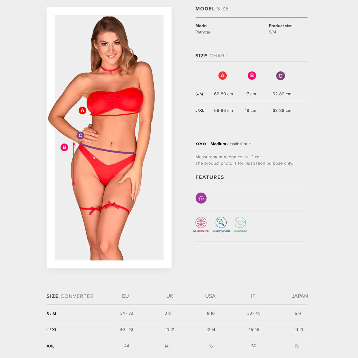 Dette 4-delte sæt består af en stropløs bh, g-streng, halsbånd og to strømpebånd, alt sammen designet i en forførende rød nuance med elegante detaljer.