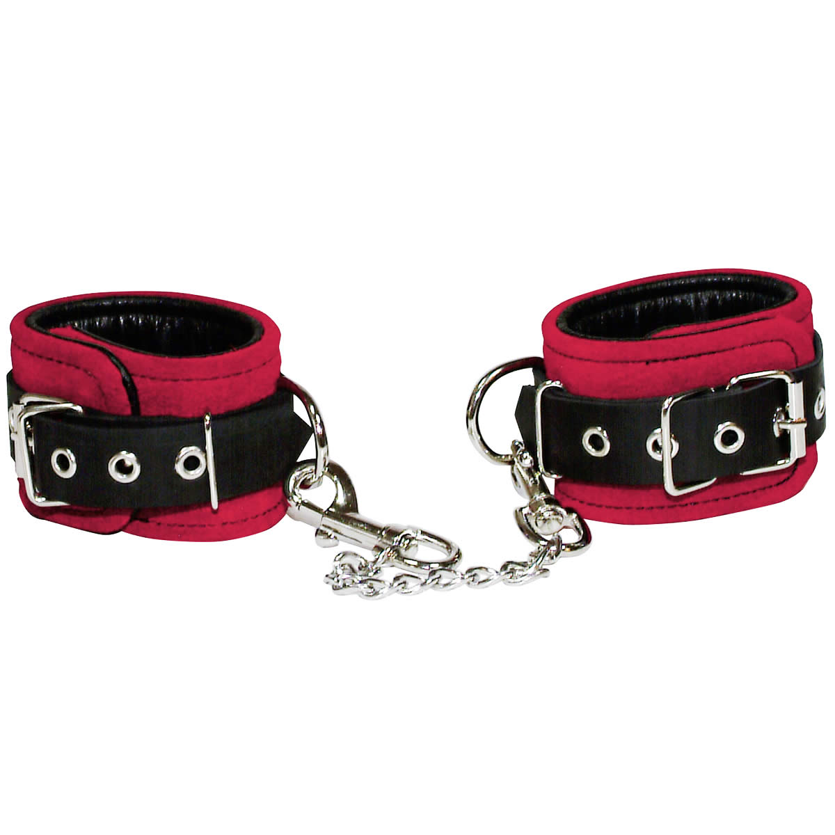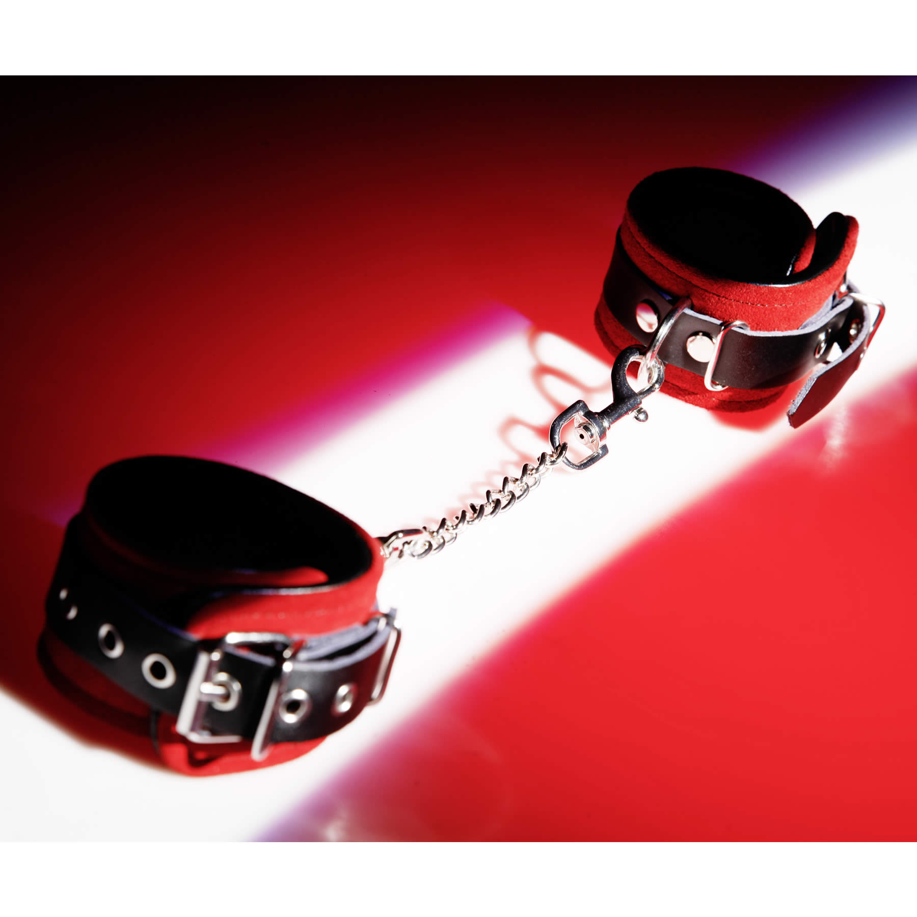 De 5,5 cm brede manchetter er udvendigt beklædt med forførende rød ruskind, mens den sorte læderinderside føles fast og glat mod huden – for maksimal komfort og dominans i ét.