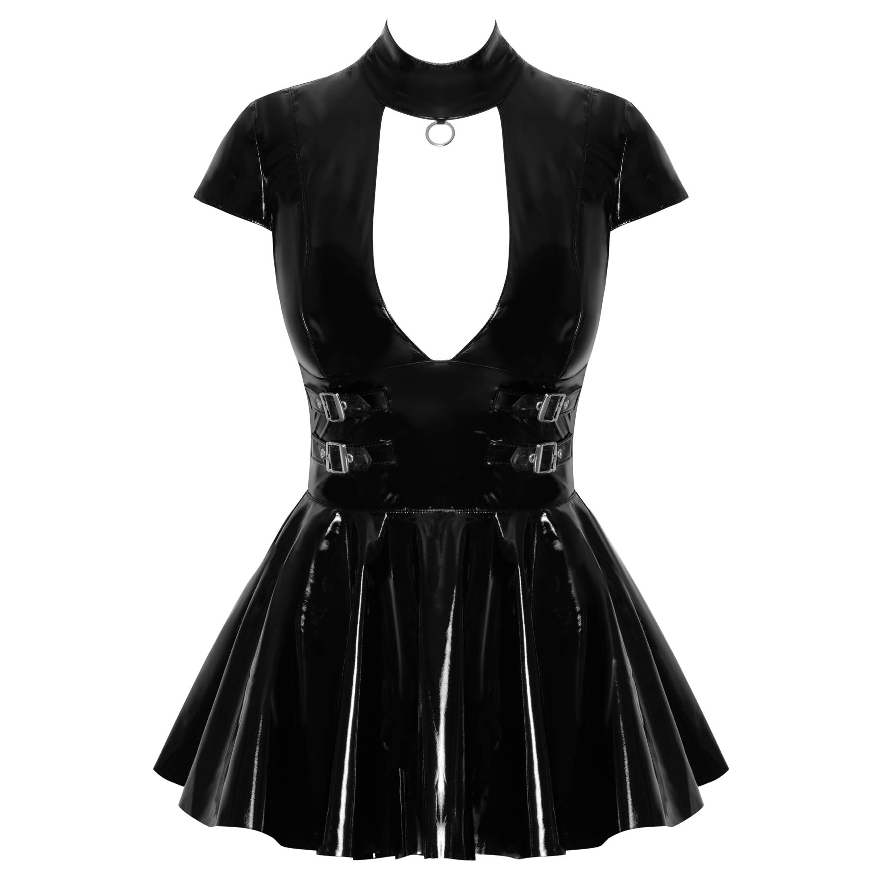 Sort lak minikjole fra Black Level med stand-up krave, bondage-ring, spænder i siderne og fuld lynlås bagpå.
