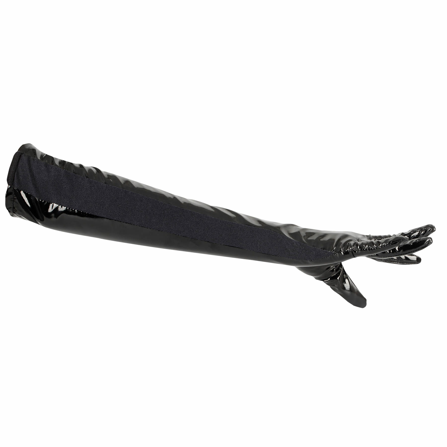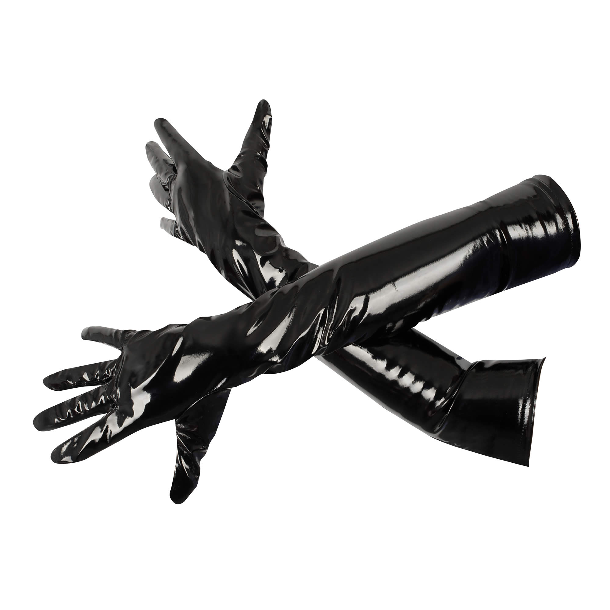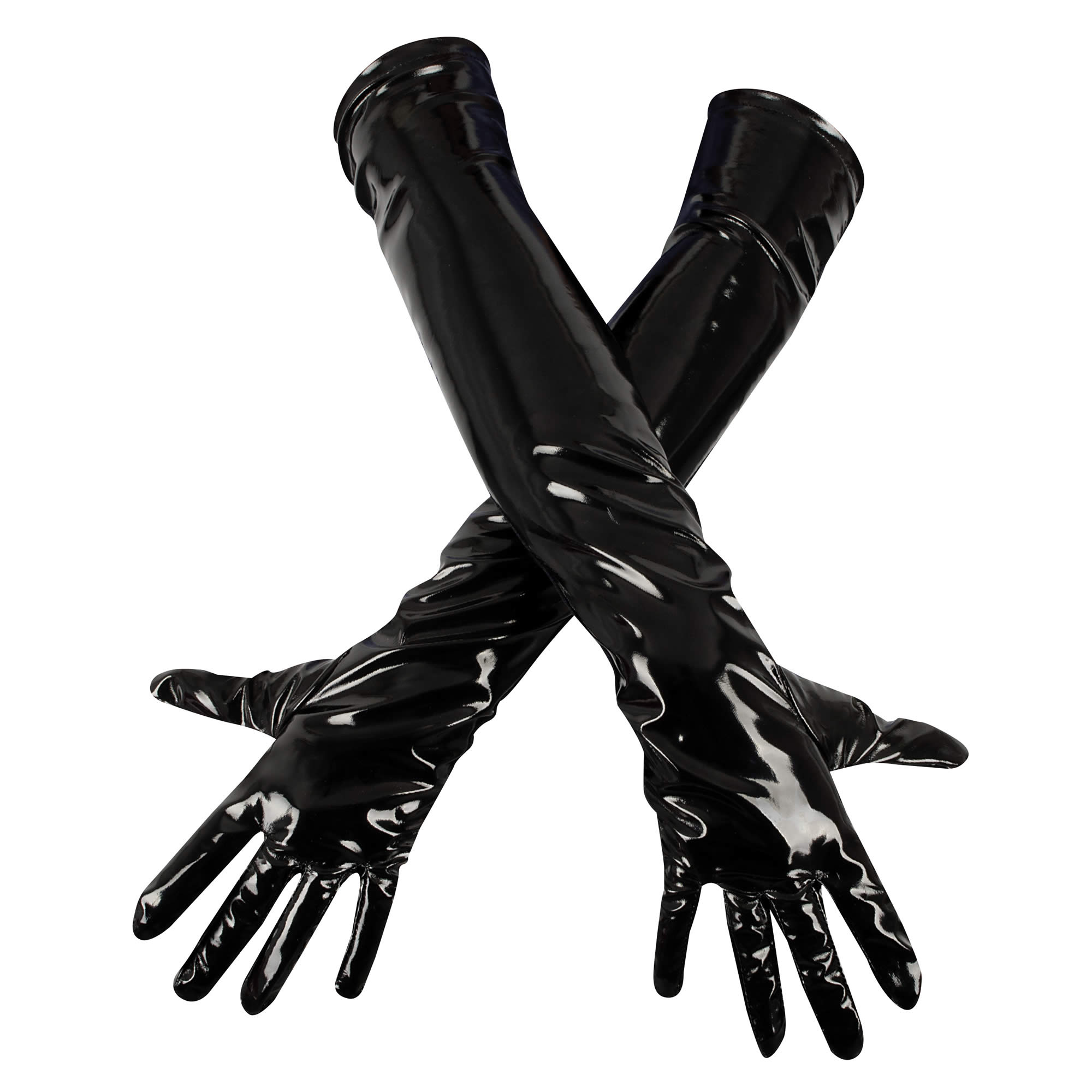 Tilføj et sensuelt og dominerende touch til dit look med disse sorte lak-handsker.