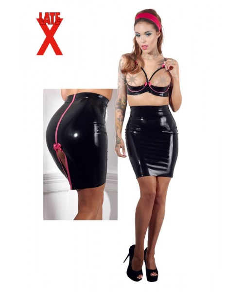 Sort latex nederdel med feminine lyserøde detaljer og fræk slids.
