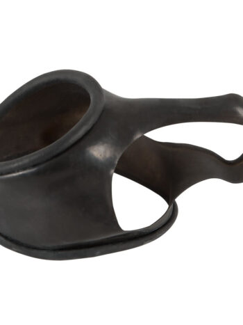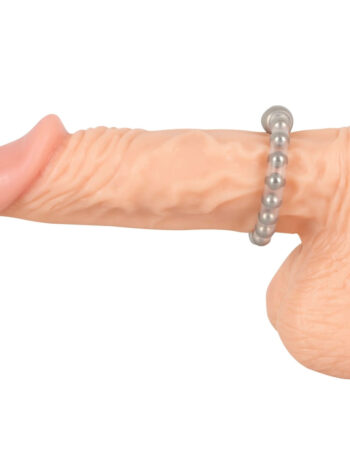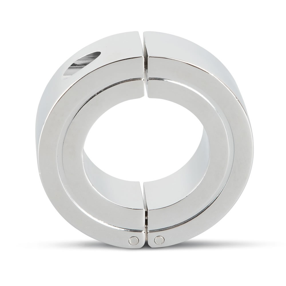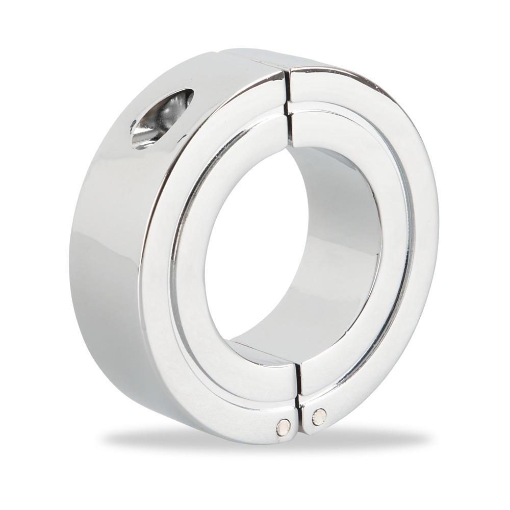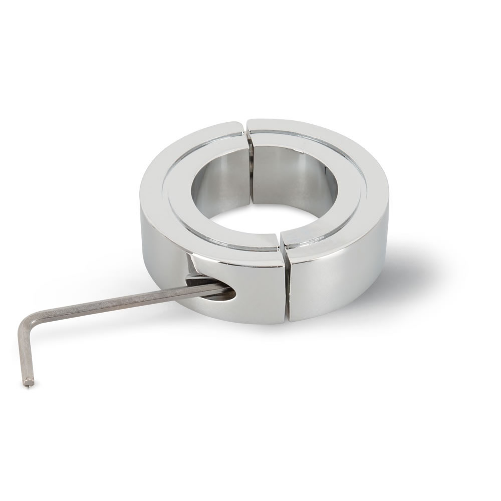 Testikelringen Lockable Ball Stretcher af Rebel bliver klædt på og med den vedlagte unbrakonøgle tæt lukket.