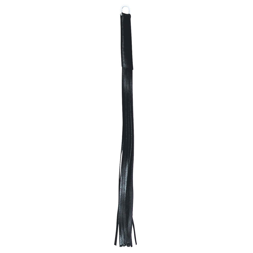 Giv dine bondagelege et frækt pift med denne mini pisk i sort læder, der kombinerer elegant håndværk med effektiv stimulation.