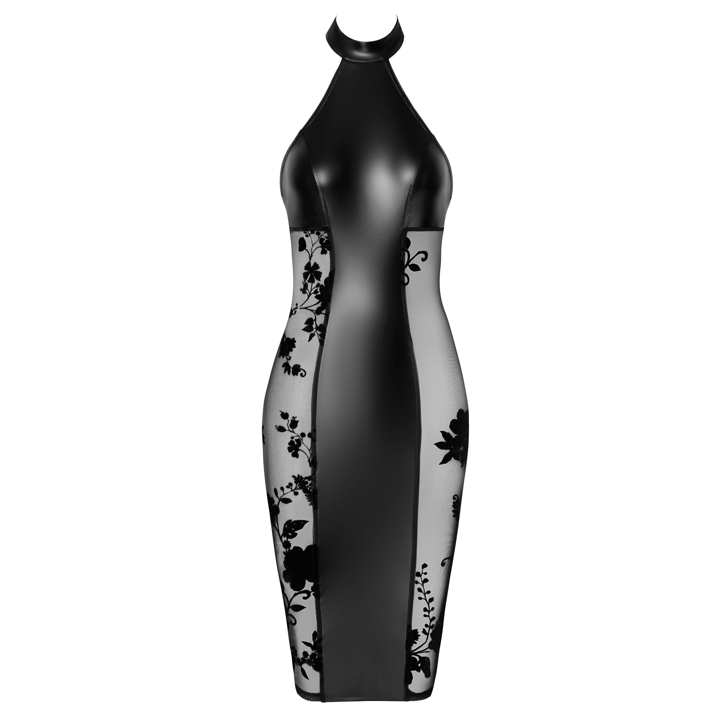 Gør dig klar til at indtage rampelyset med denne knælange, tætsiddende kjole fra Noir, der kombinerer mat skinnende powerwetlook med gennemsigtige powernet-indsatser for et ekstra pirrende udtryk.