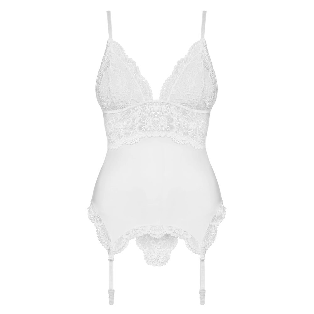 Heavenly temptation! Beautiful basque with seductive lace inserts and adjustable bra and suspender straps.