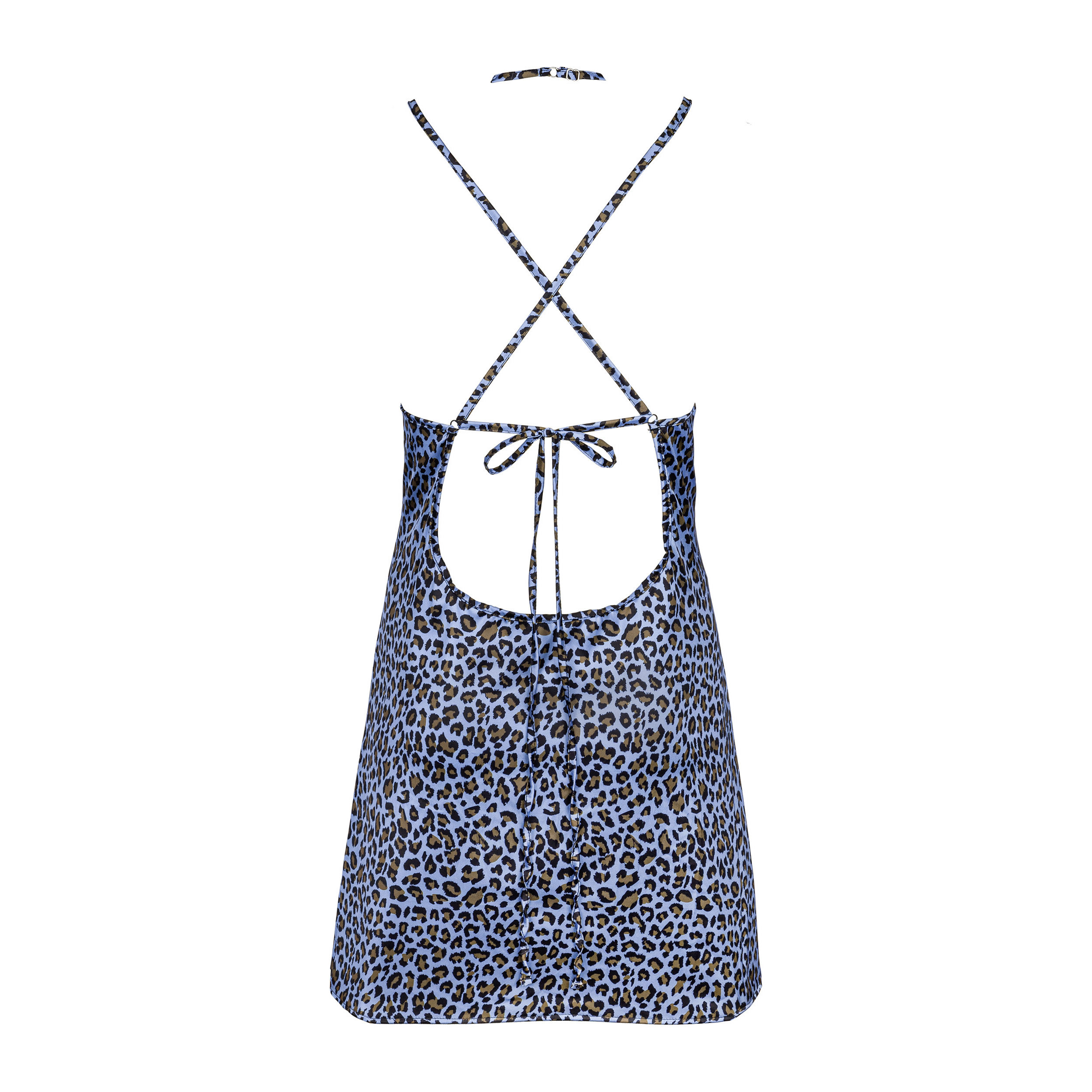 Dette forførende sæt består af en chemise og en matchende g-streng, designet til at fremhæve din sensualitet med en unik kombination af dybblå satin og frækt leopardmønster.