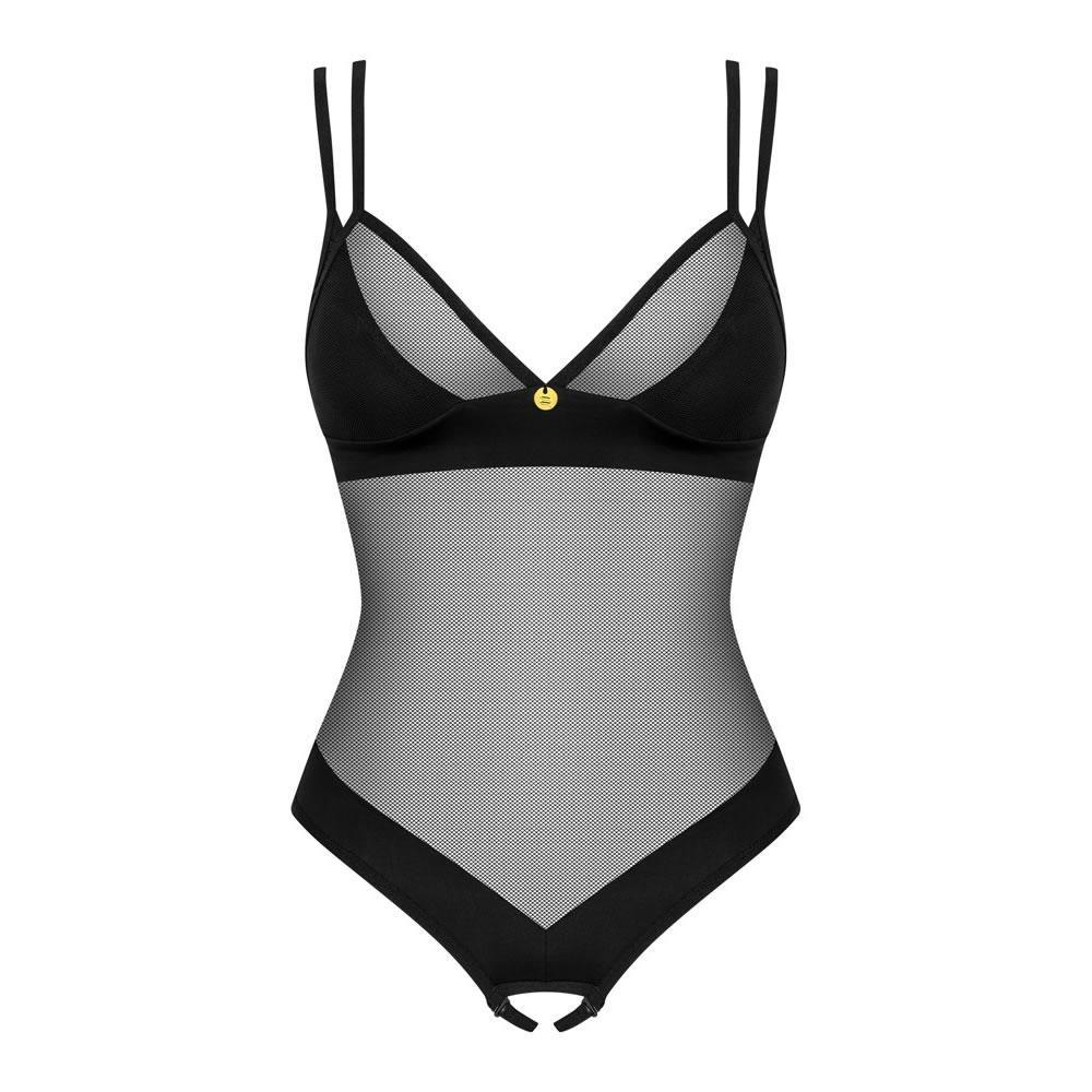 Denne forførende body kombinerer delikat gennemsigtig sort mesh med stilfulde, uigennemsigtige detaljer.