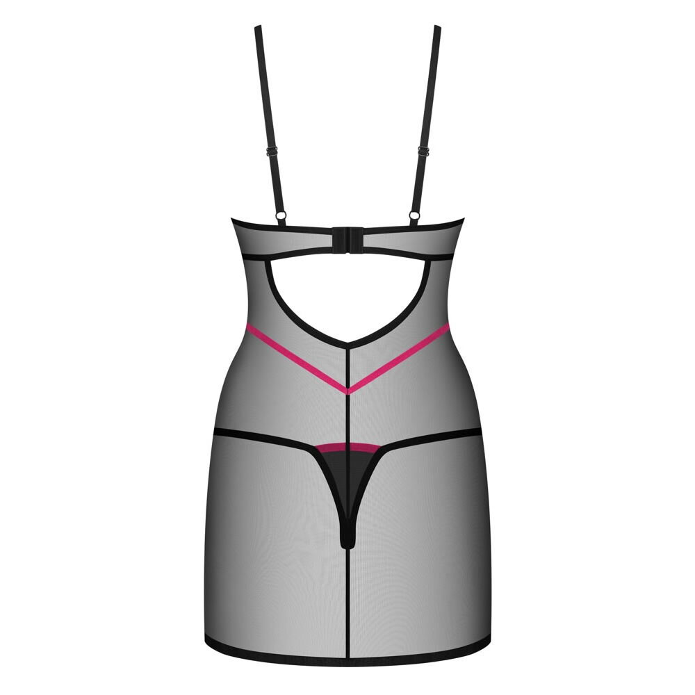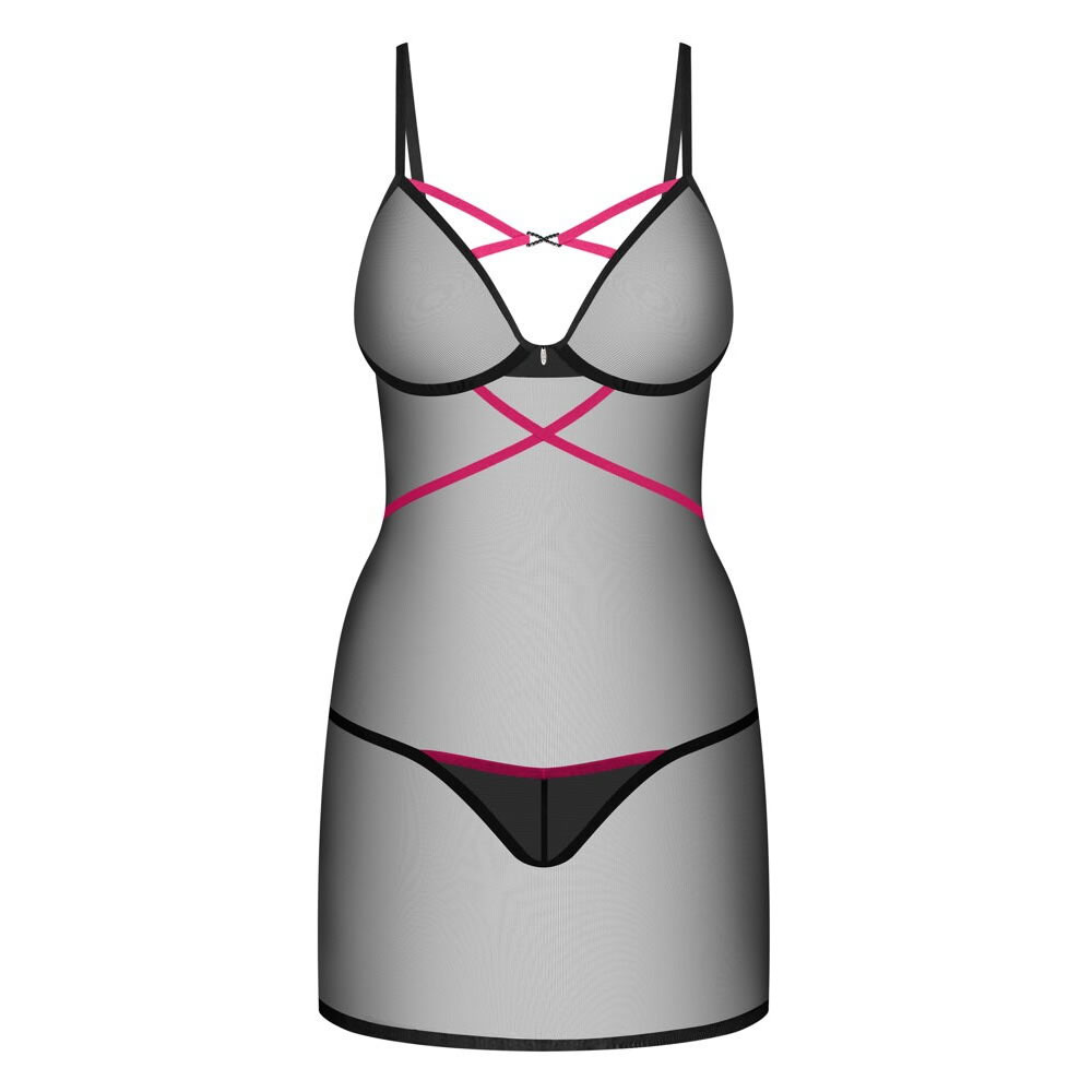 Dette 2-delte sæt består af en chemise og en matchende g-streng, begge fremstillet i delikat sort powernet, der smyger sig om kroppen med en frækt gennemsigtig effekt.