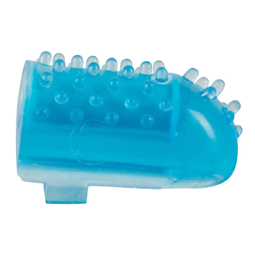 Blå, noppet fingervibrator med elastisk sløjfe.