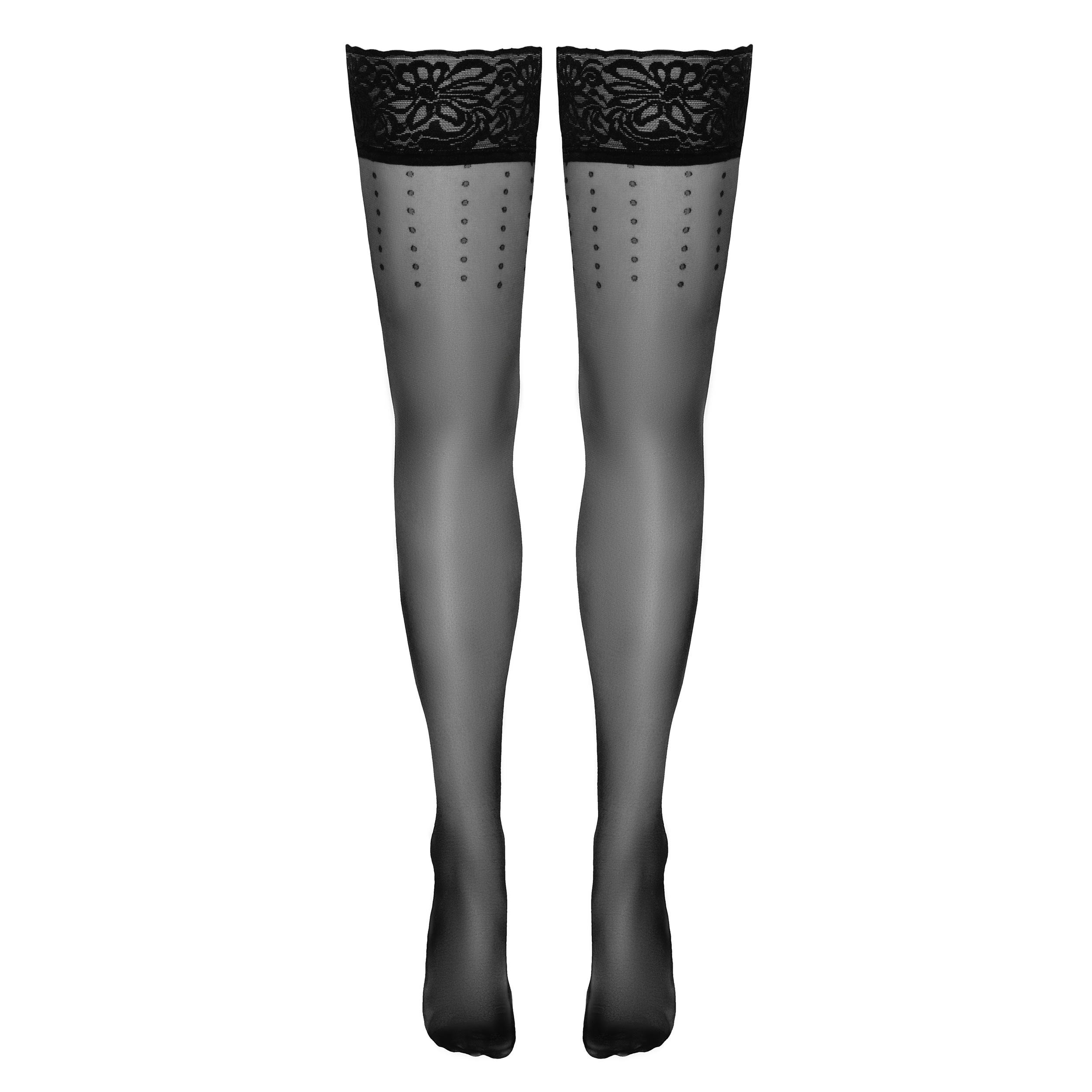 Den brede blondekant med silikoneforstærkning sikrer en perfekt skridsikker pasform, så strømperne bliver siddende uanset dine bevægelser.