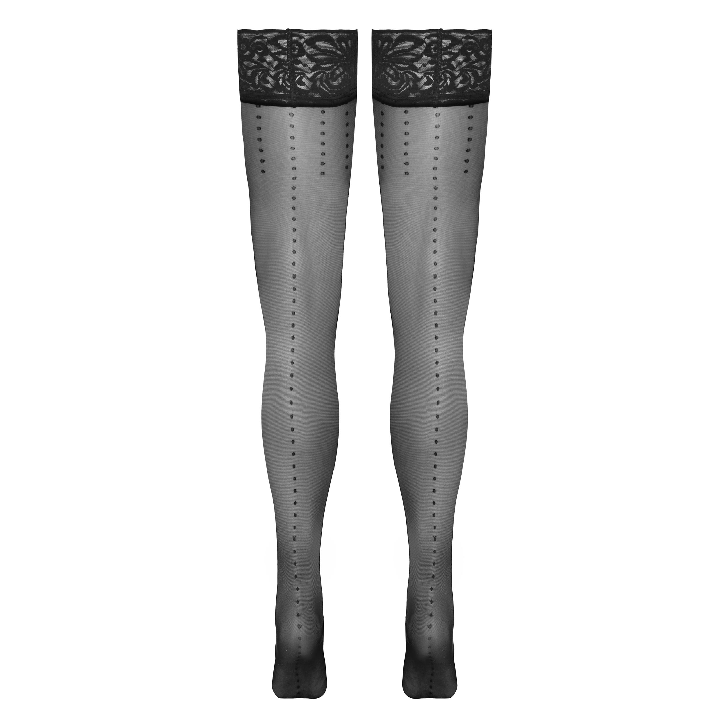 Disse sorte selvsiddende strømper kombinerer silkeagtig lethed med et legende prikket mønster, der elegant følger benene og skaber en forførende effekt.