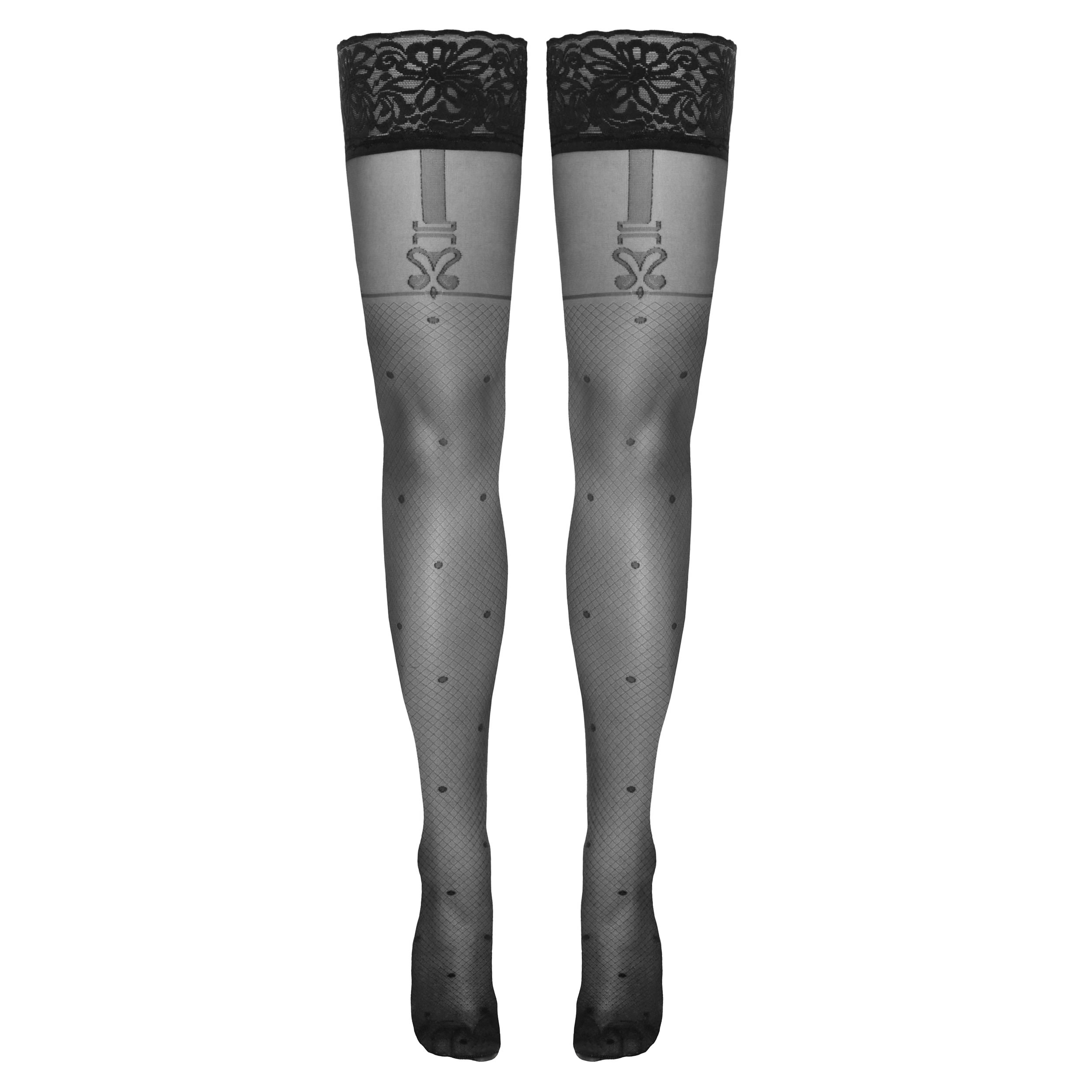 Lad dine ben lege med sanserne i disse sorte selvsiddende strømper, der kombinerer et koket netlook med legesyge prikker og indvævede seler for en unik og sensuel detalje.