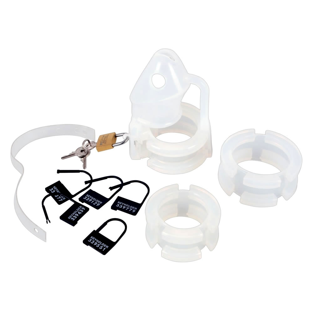 Det omfattende sæt indeholder i alt 15 komponenter: 1 kyskhedsbælte, 3 ringe, 2 løkker med huller, 1 prop, 1 metallås med 2 nøgler, 5 plastiklåse med numre trykt på.