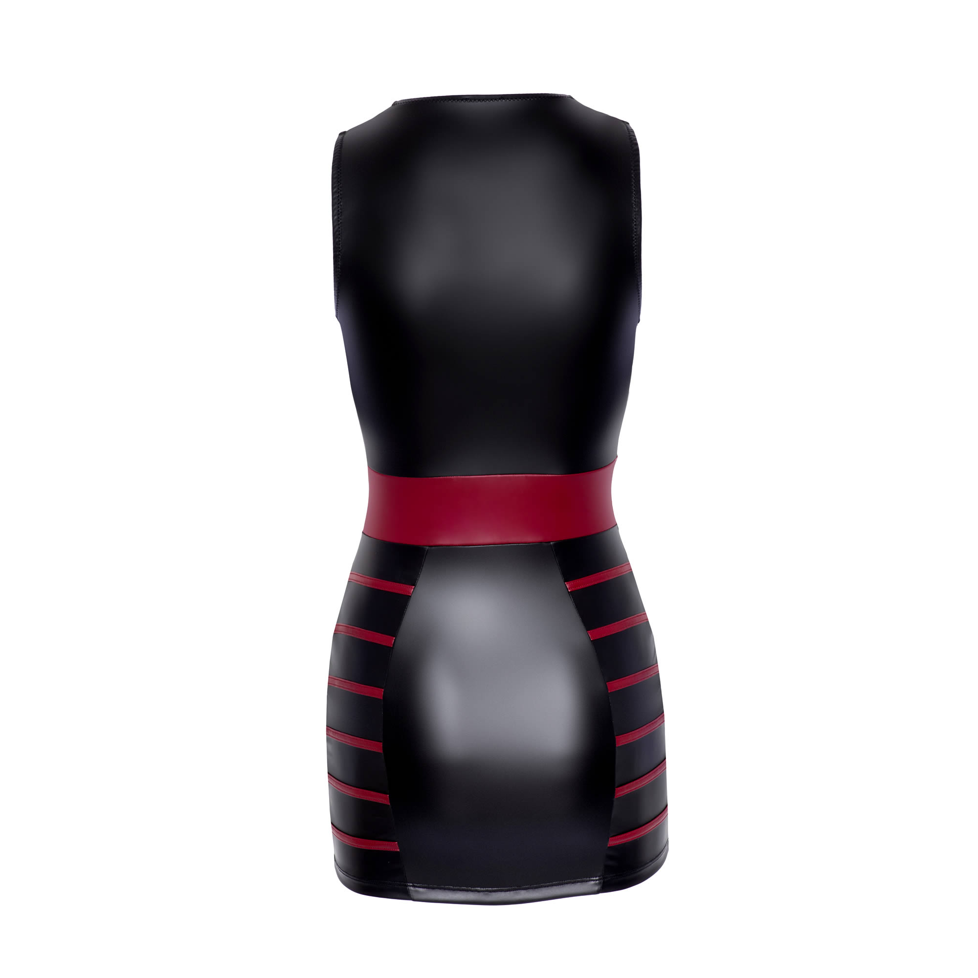 Den sorte base med kontrasterende røde sidestriber og taljeindsats skaber en slankende effekt, der naturligt fremhæver din figur.