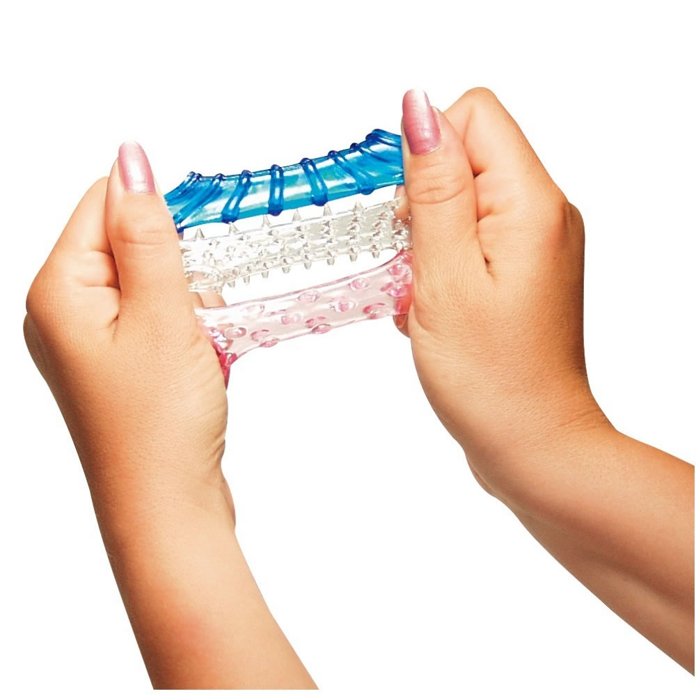 Sæt med 3 elastiske silikonesleeves med riller og nopper.