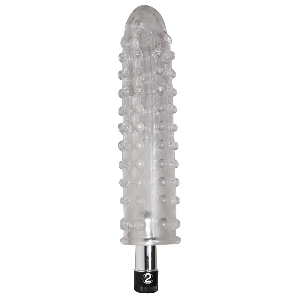Transparent penis sleeve med kraftige nopper og indbygget vibroæg i spidsen.