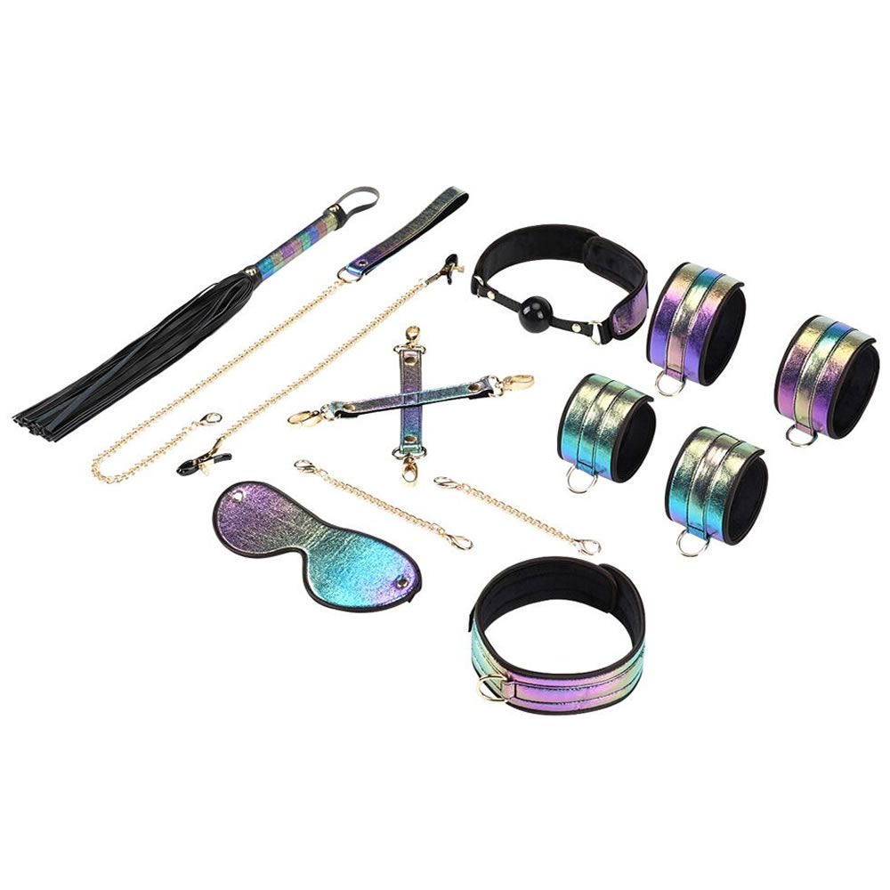 Dette 8-delte luksussæt skiller sig ud med sit glossy perlemors- og regnbuefarvede design med gyldne metal-detaljer – en eksklusiv kombination, der er perfekt til nysgerrige begyndere & erfarne BDSM-entusiaster.