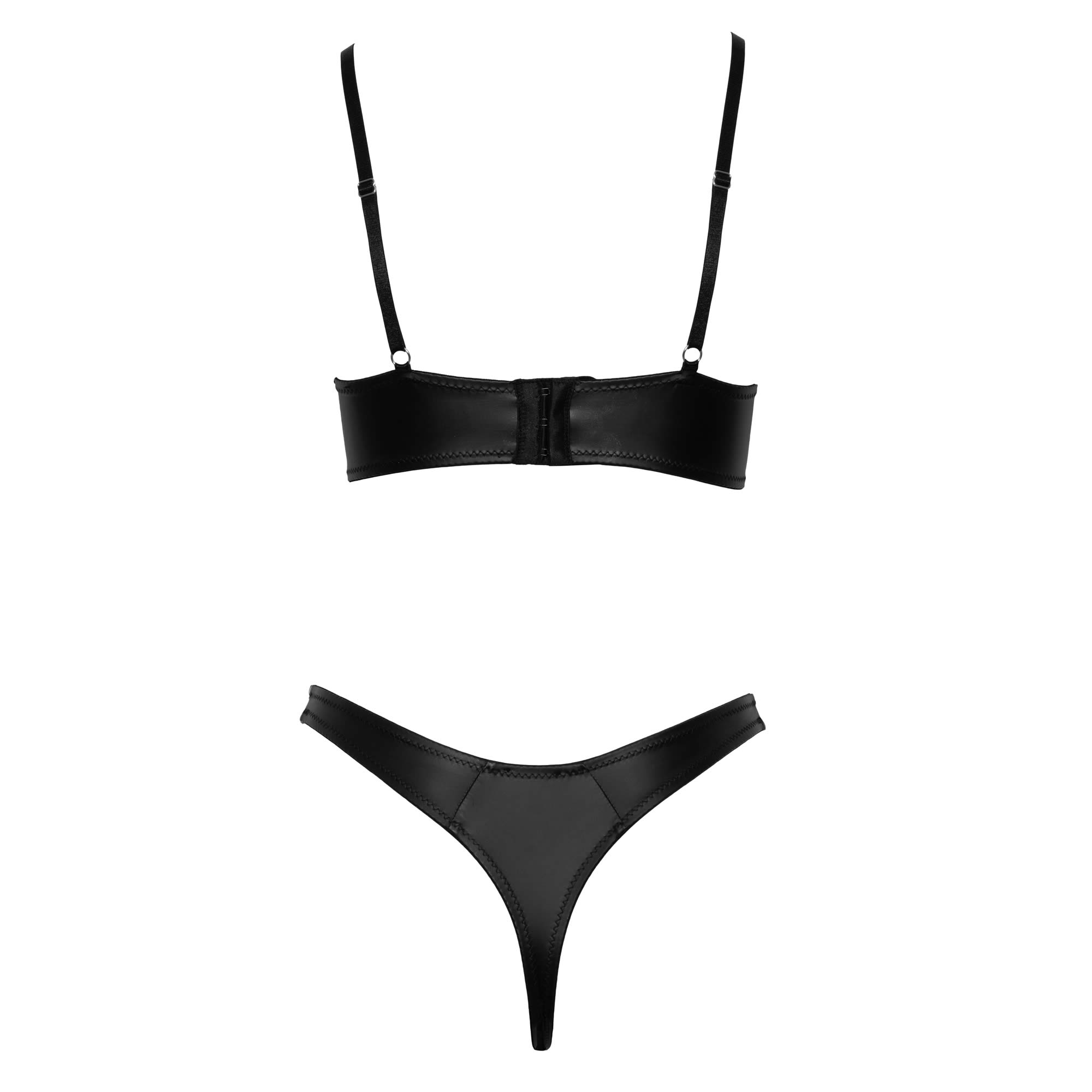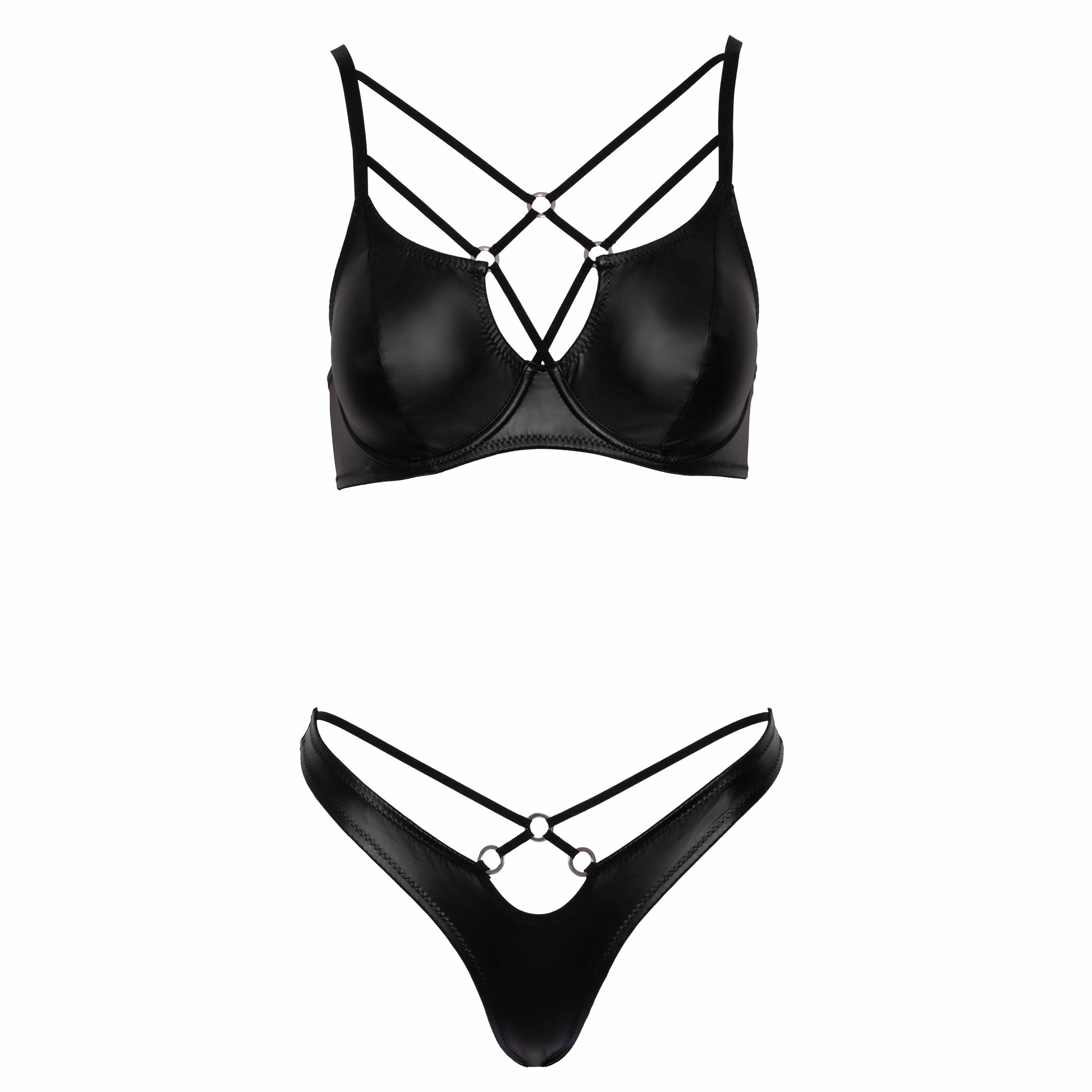 Sættet består af en bøjle-bh og en rio-g-streng, udsmykket med stretchstropper og sølvfarvede ringe, der fremhæver dekolletagen og taljen på en forførende måde.