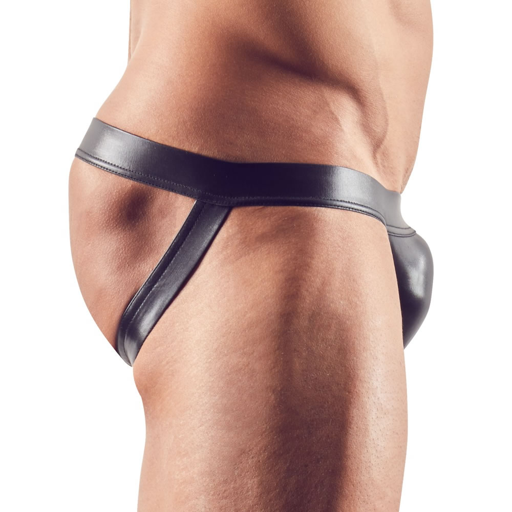 Elastisk jock i sort wetlook. Materiale: 92% polyester, 8% elastan.