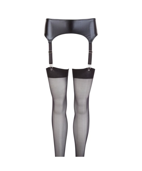 Forkæl dig selv eller din partner med dette frække wetlook sæt bestående af en sort hofteholder og matchende nylonstrømper.